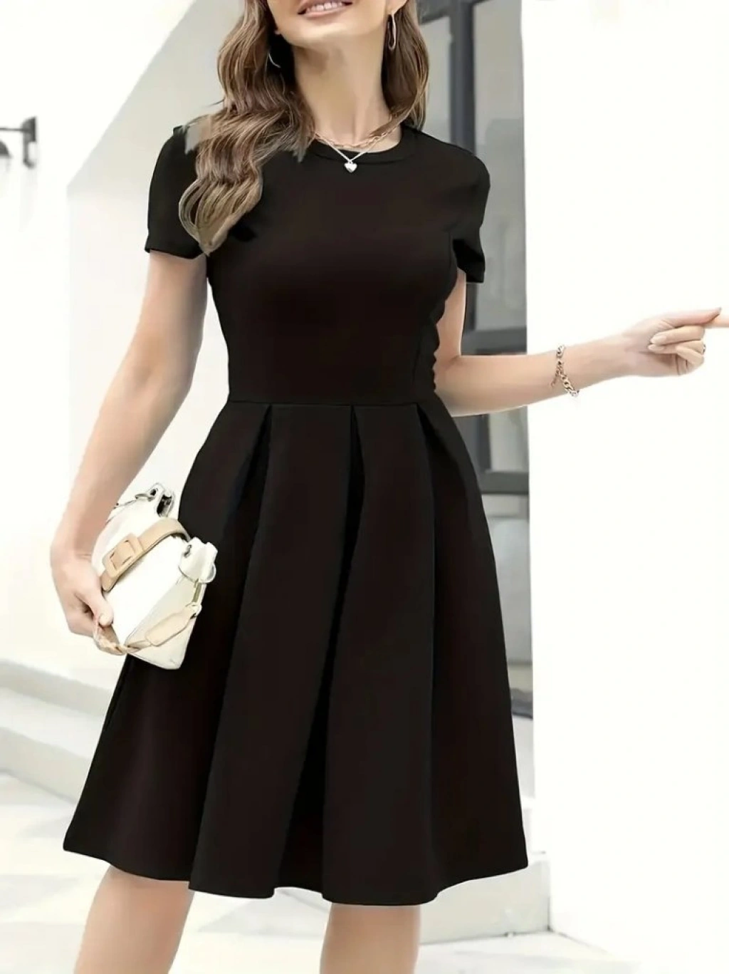 Kadın Kısa Kollu Bisiklet Yaka önden Pile Detaylı Janjan Krep Elbise