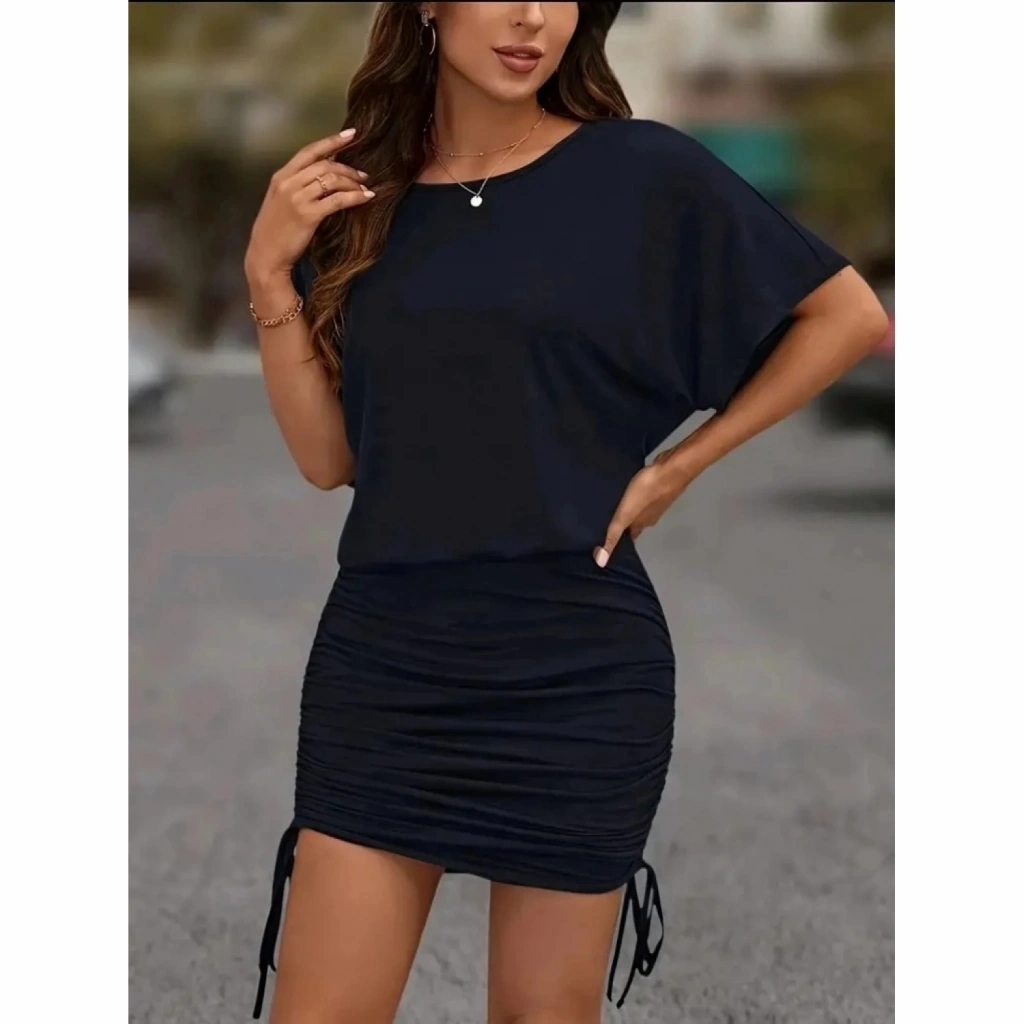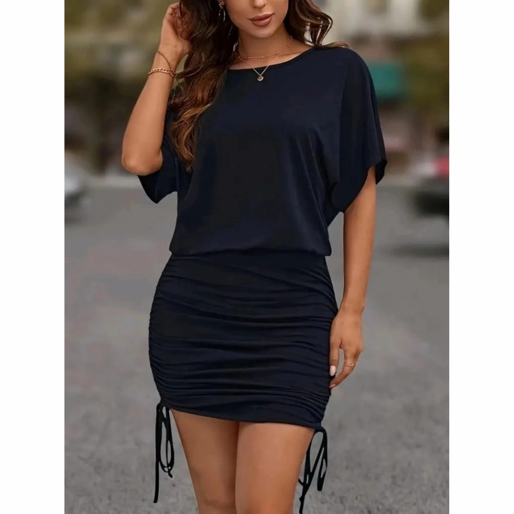 Kadın Kısa Kollu Bisiklet Yaka Yanlardan Büzgülü Kısa Viskon Elbise