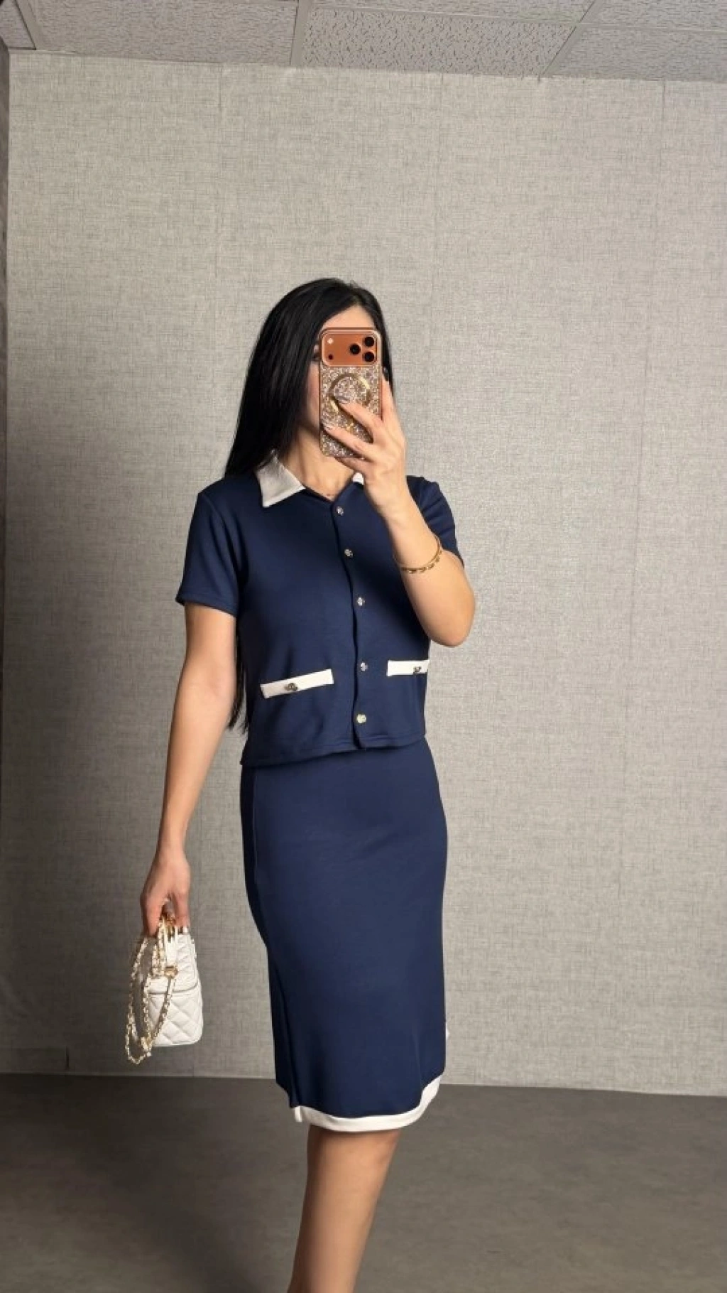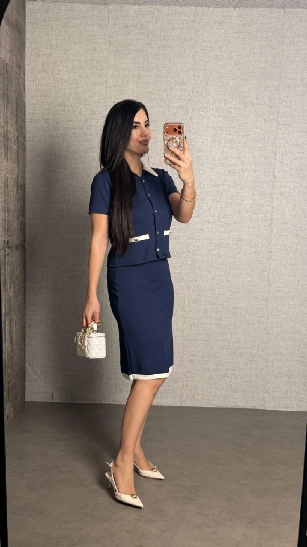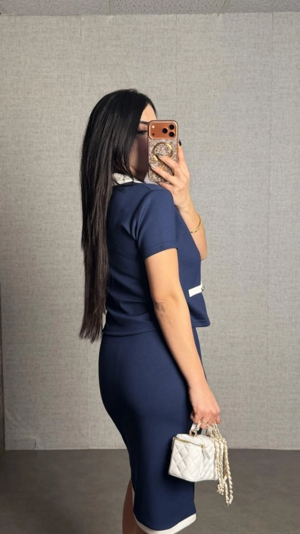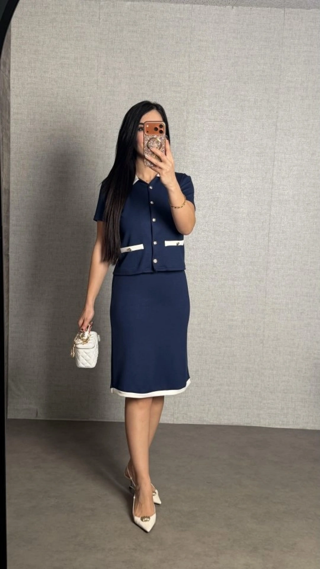 Kadın Kısa Kollu Cep Ve Düğme Detay Ceket Ve Diz üstü Etek Ikili Takım