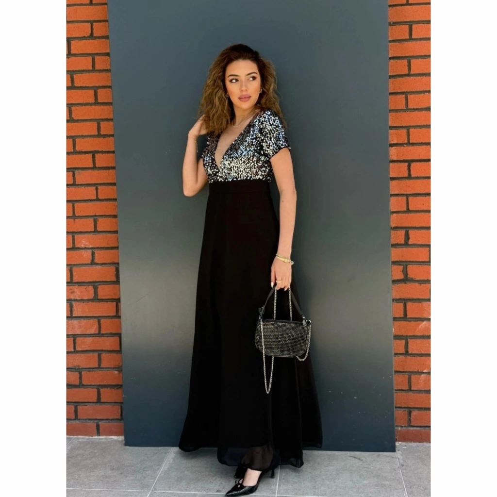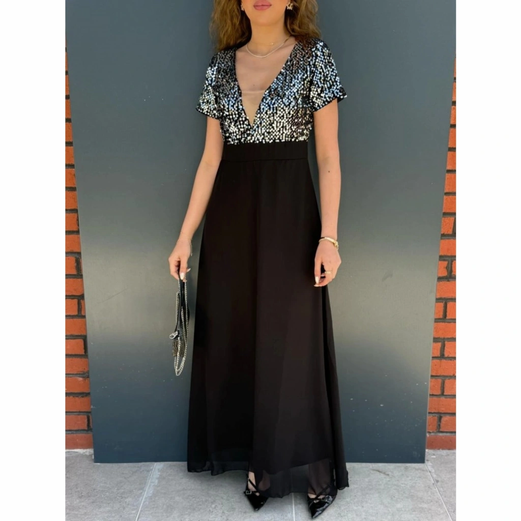 Kadın Kısa Kollu Derin V Yakalı A Kesim Pulpayet Detaylı şifon Nedime Elbisesi