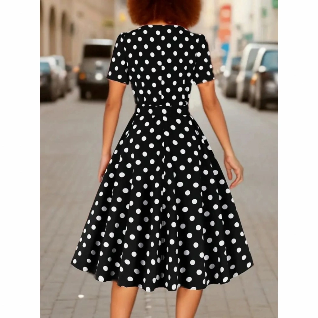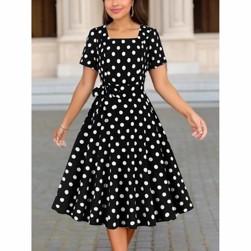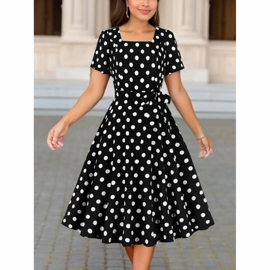 Kadın Kısa Kollu Geometrik Yaka Puantiyeli Kiloş Midi Süprem Elbise
