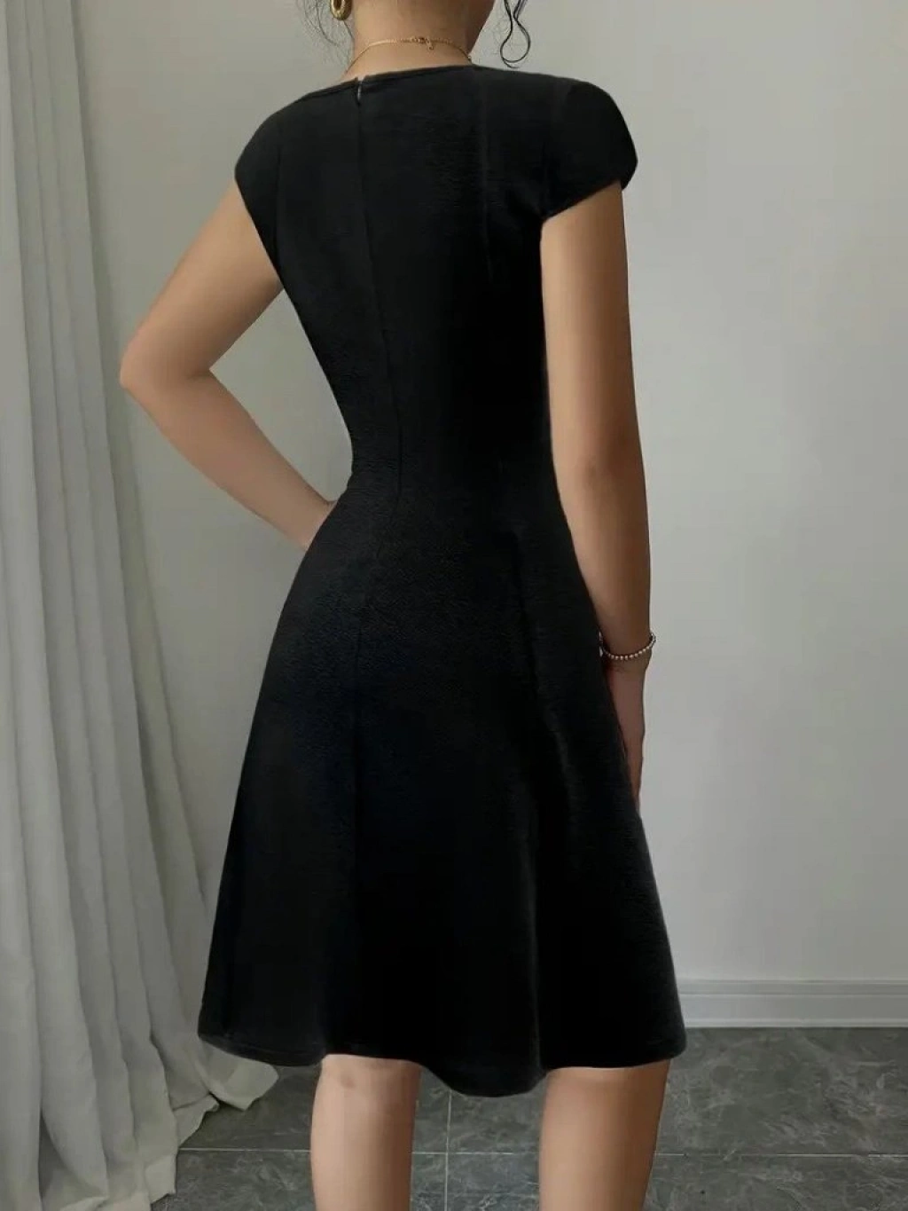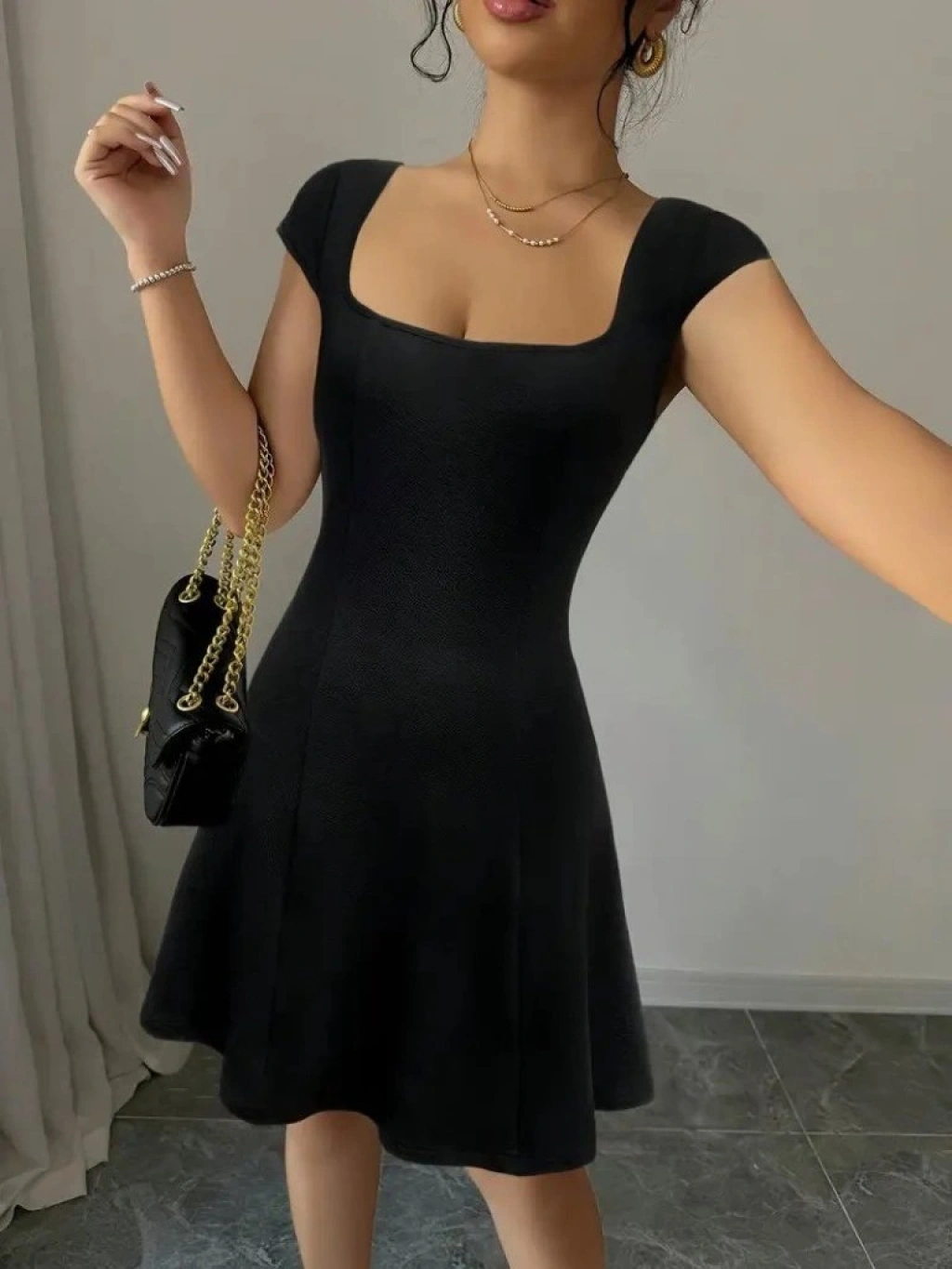 Kadın Kısa Kollu Geometrik Yakalı Janjan Krep Elbise