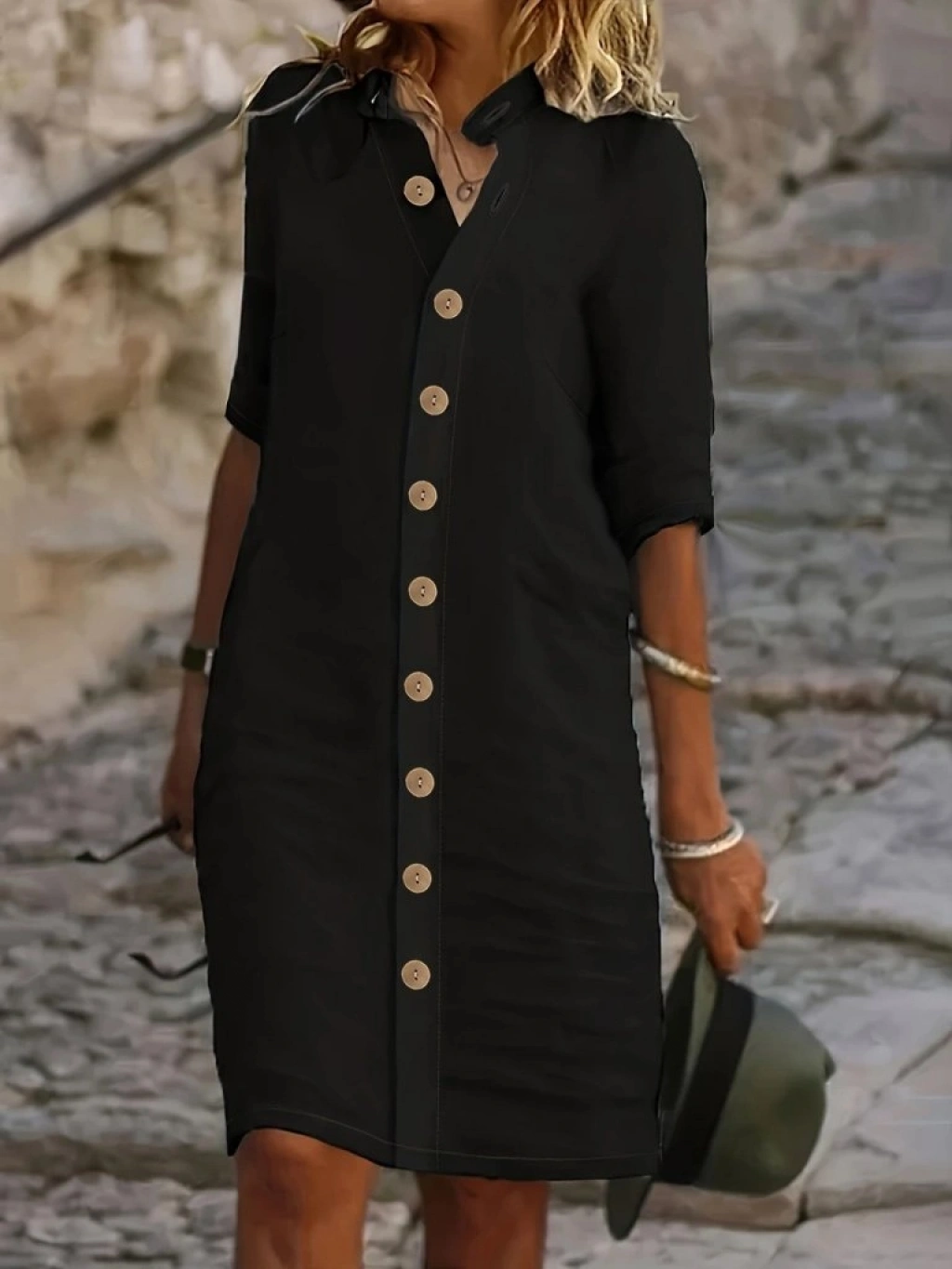 Kadın Kısa Kollu Hakim Yaka önden Düğmeli Kısa Müslim Elbise