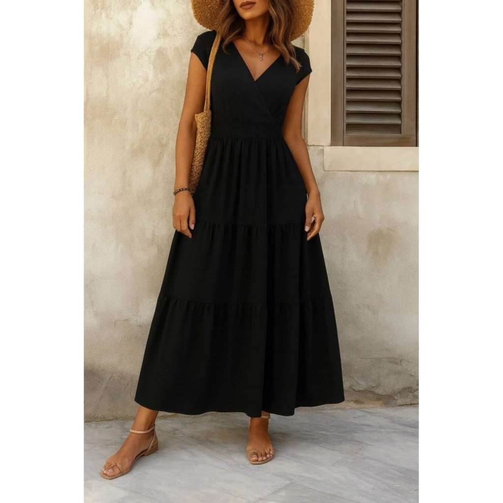 Kadın Kısa Kollu Kruvaze Yaka Beli Lastikli Süprem Maksi Boy Elbise