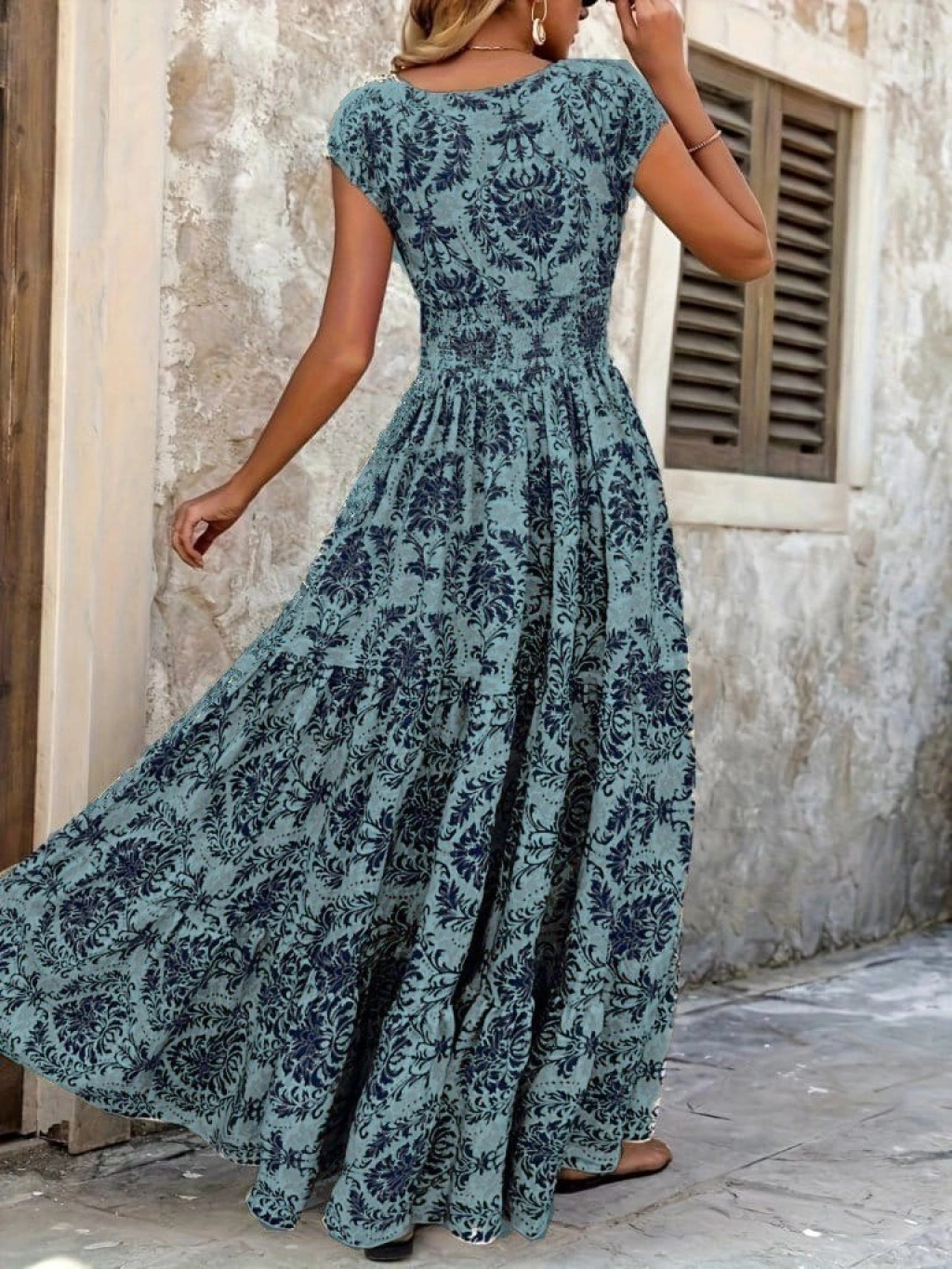 Kadın Kısa Kollu Kruvaze Yaka Beli Lastikli Süprem Maksi Boy Elbise