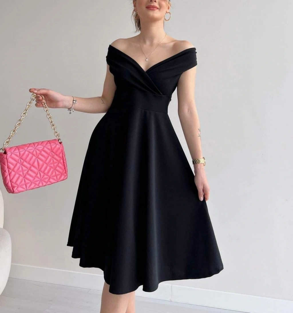 Kadın Kısa Kollu Kruvaze Yaka Eteği Volanlı Krep Elbise