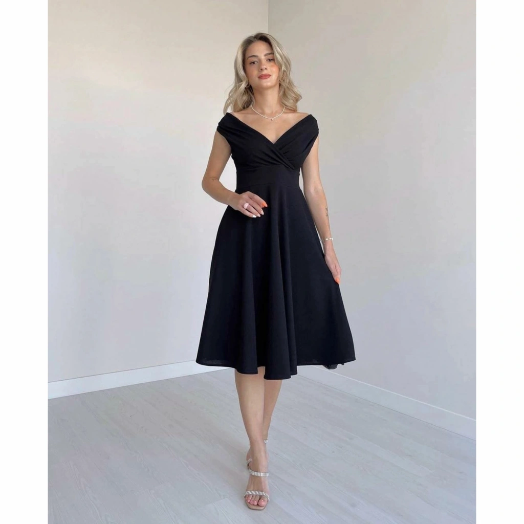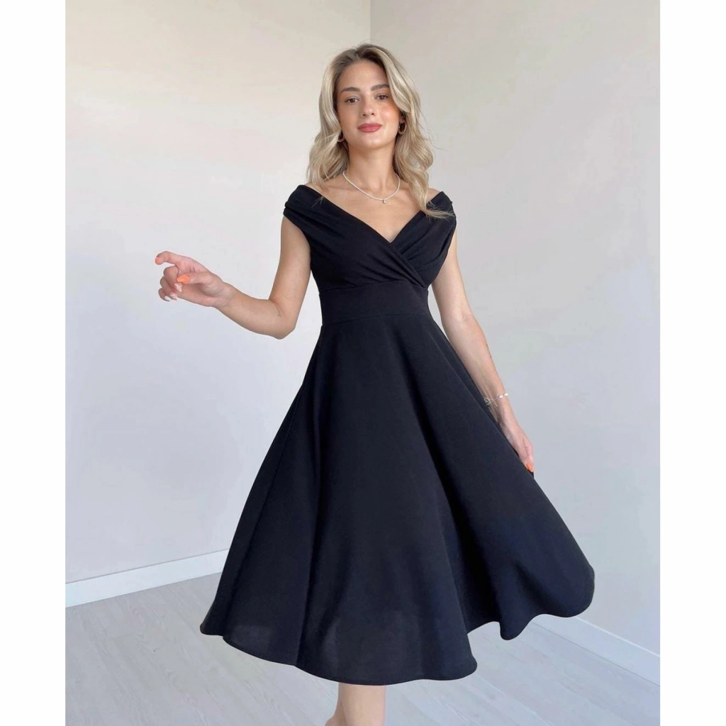 Kadın Kısa Kollu Kruvaze Yaka Eteği Volanlı Krep Elbise