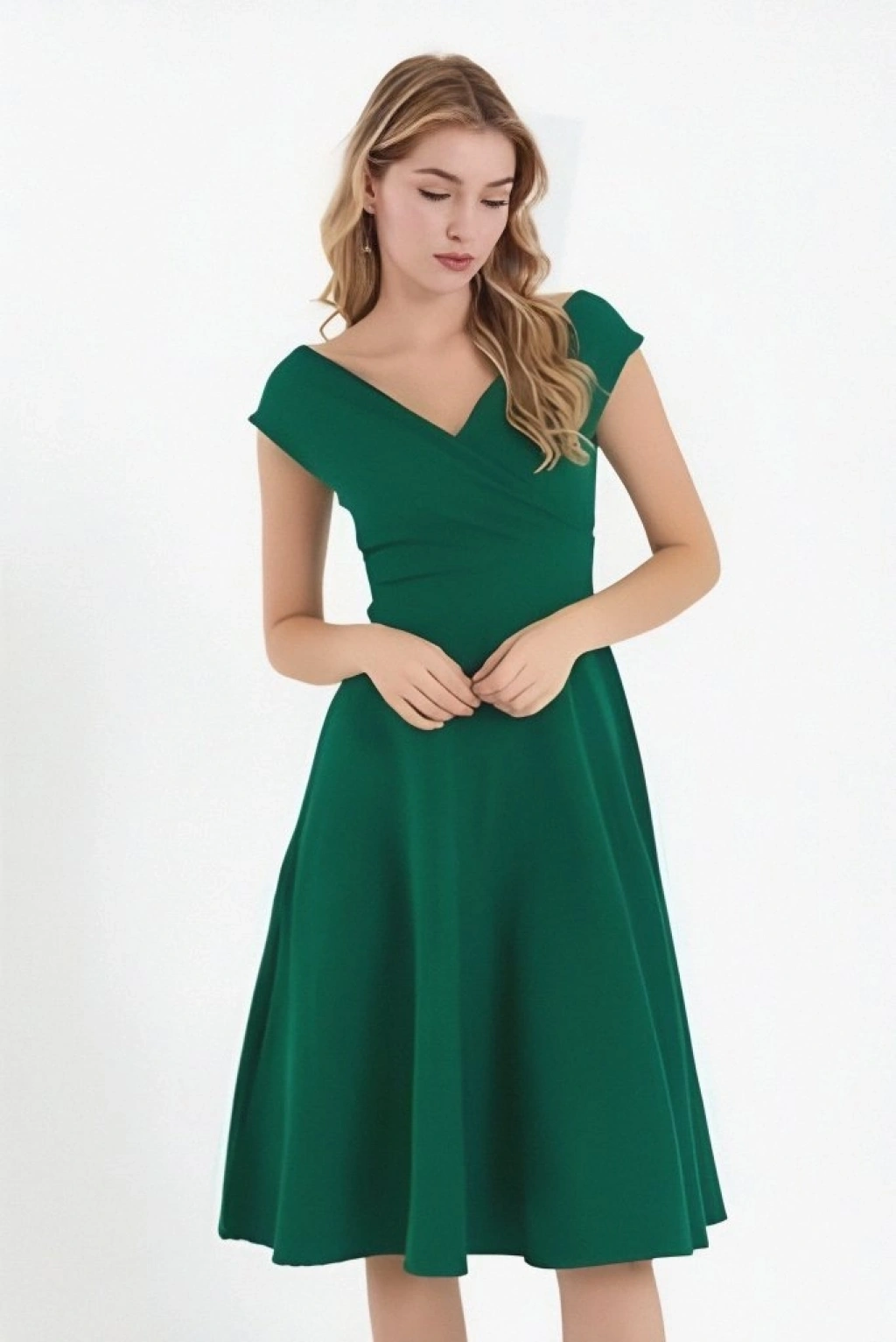 Kadın Kısa Kollu Kruvaze Yaka Eteği Volanlı Krep Elbise