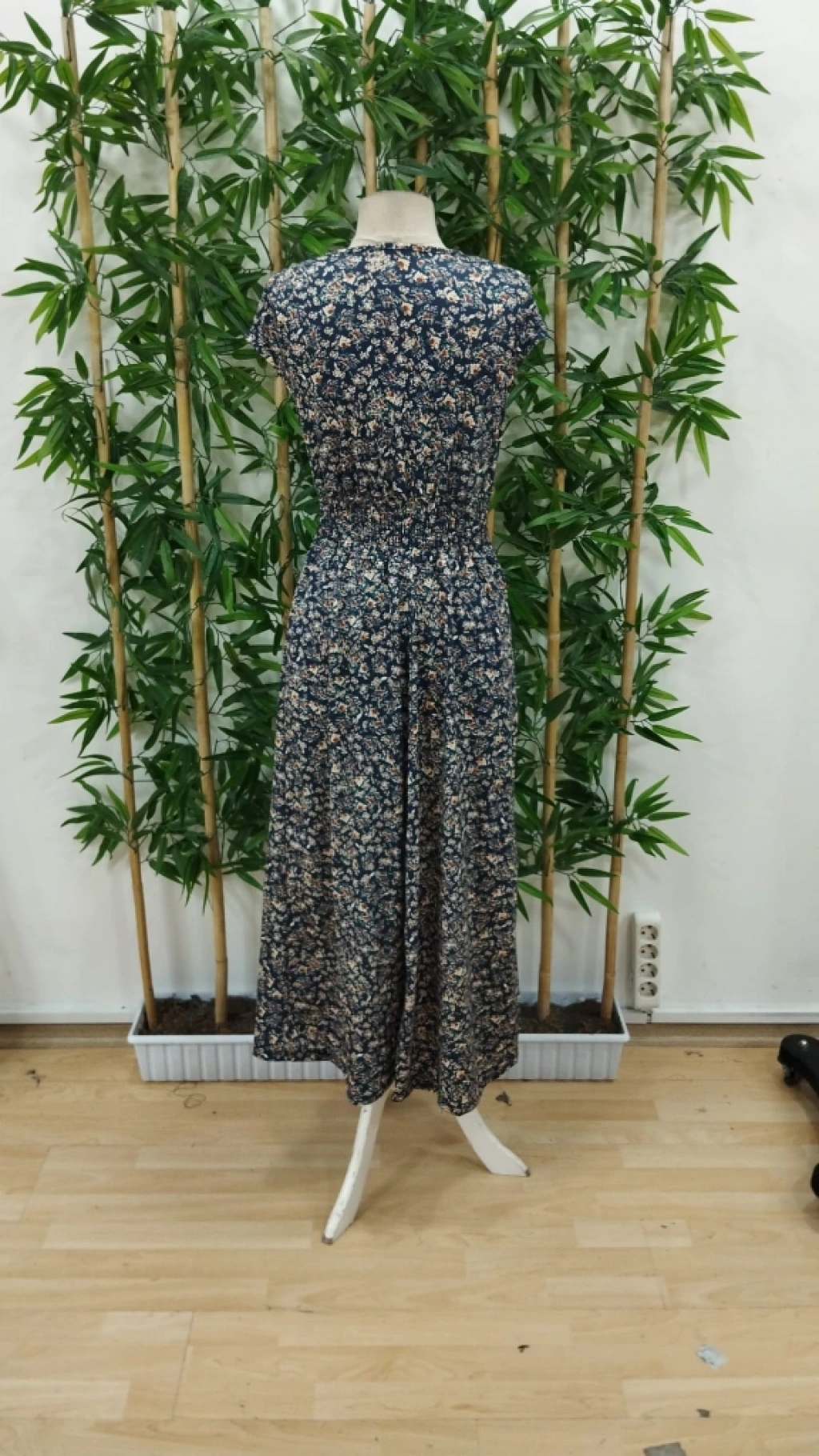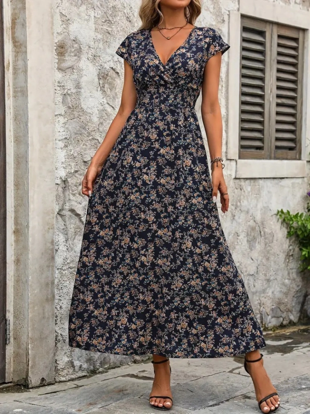 Kadın Kısa Kollu Kruvaze Yakalı çiçek Desenli Belden Lastikli Süprem Uzun Elbise