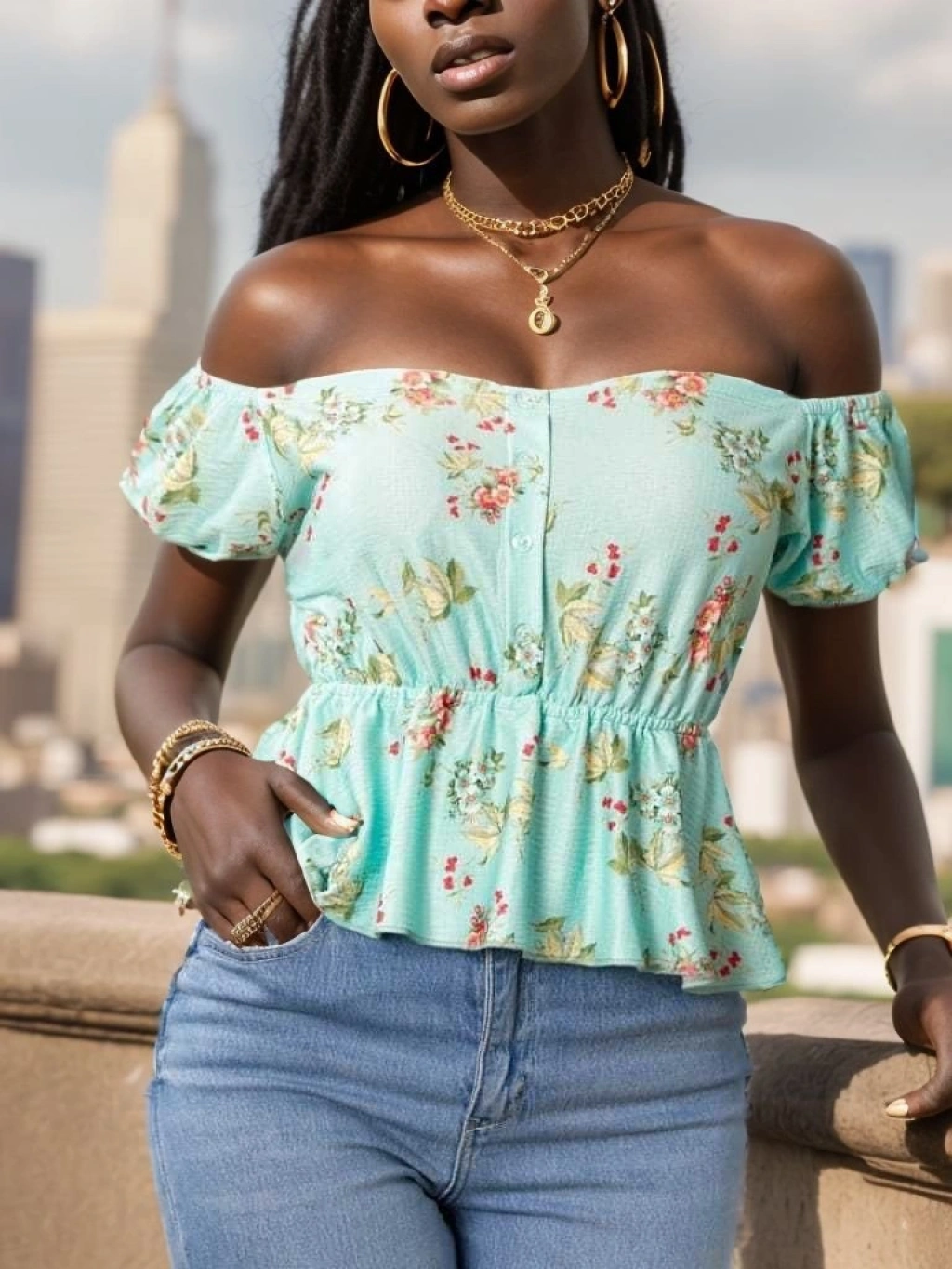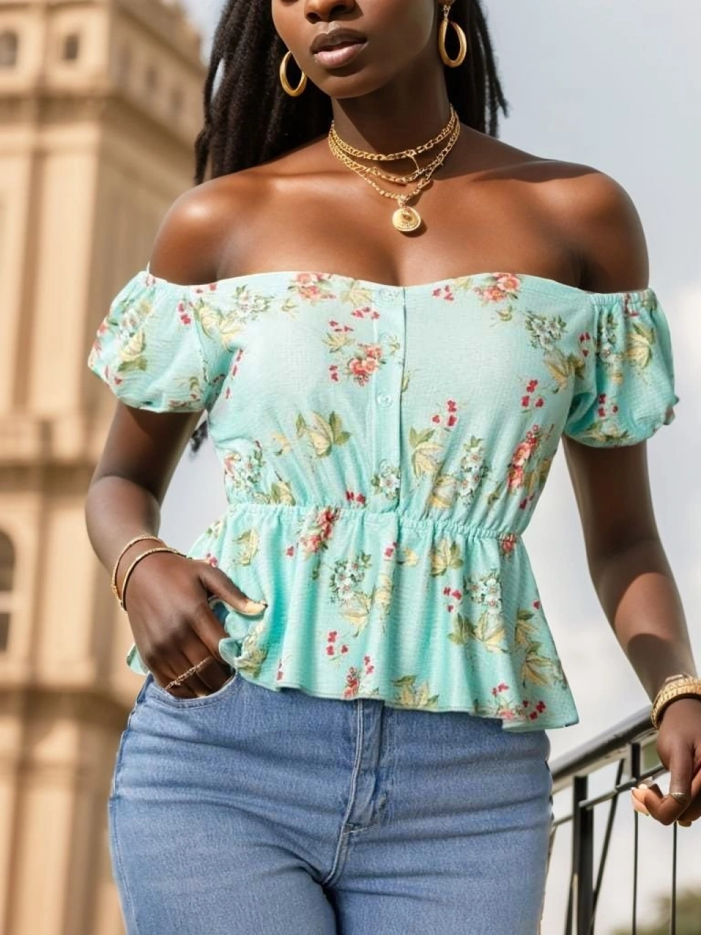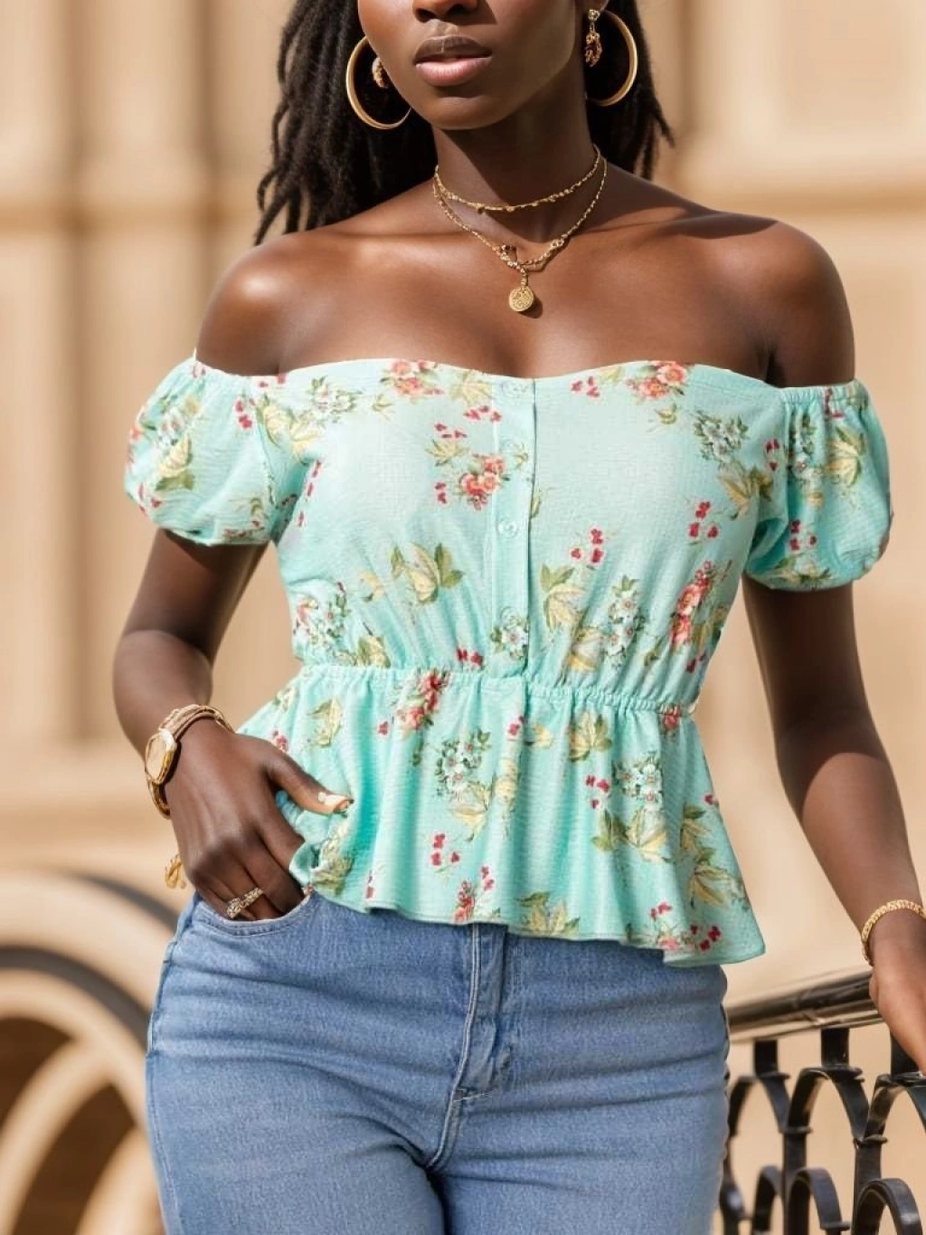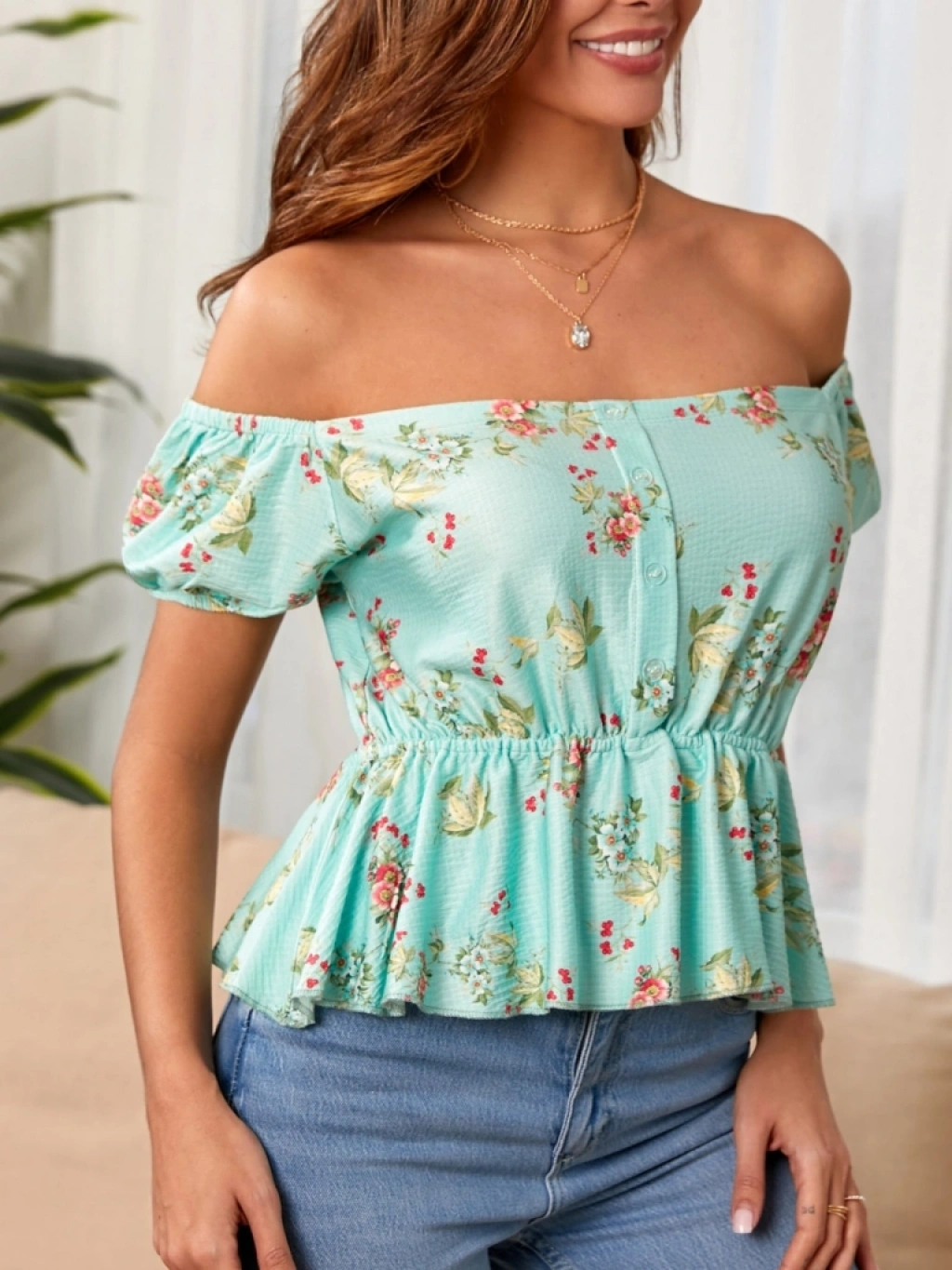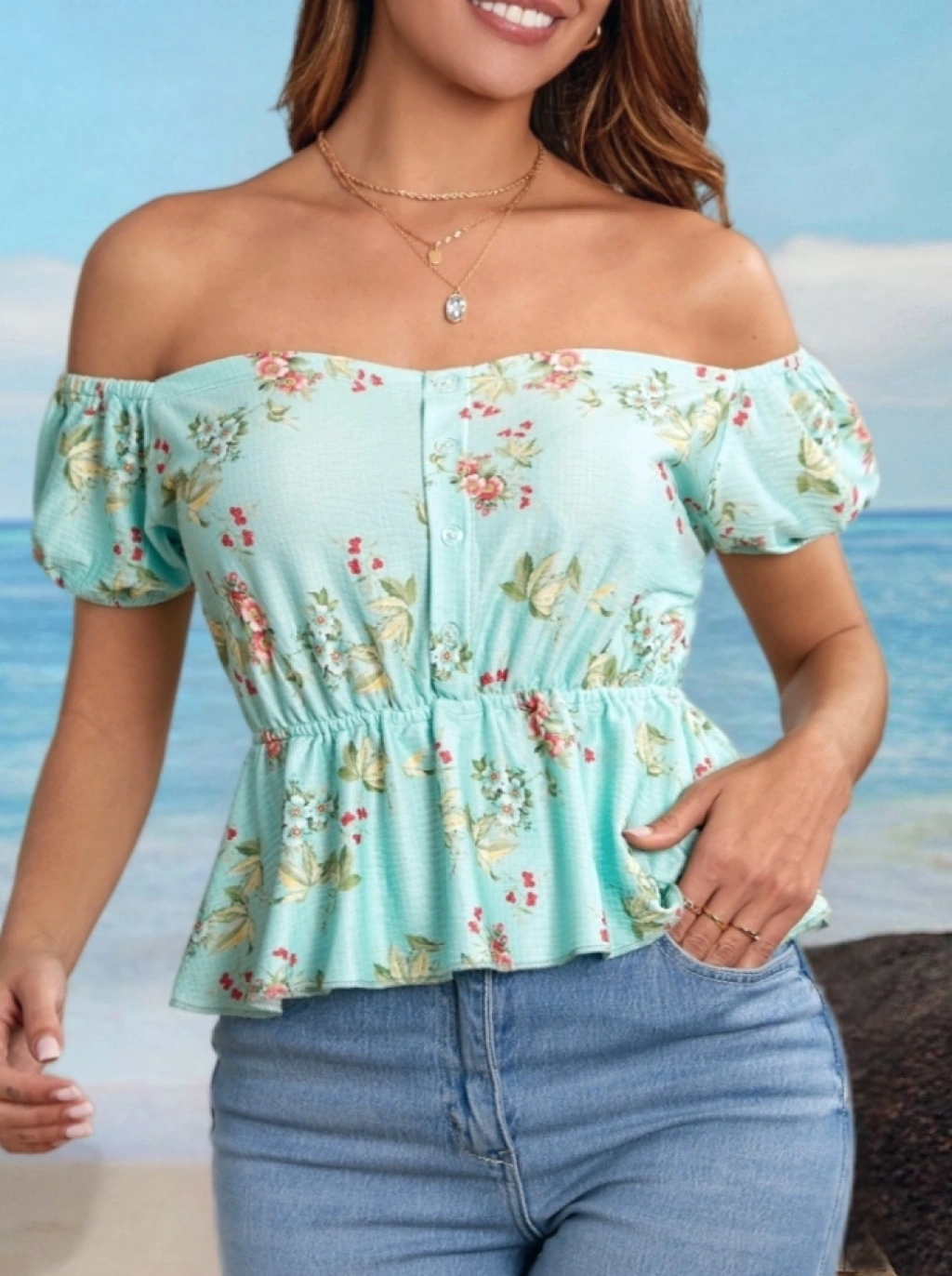 Kadın Kısa Kollu Madonna Yaka çiçek Desenli Düğme Detay Gipeli Süprem Kumaş Bluz