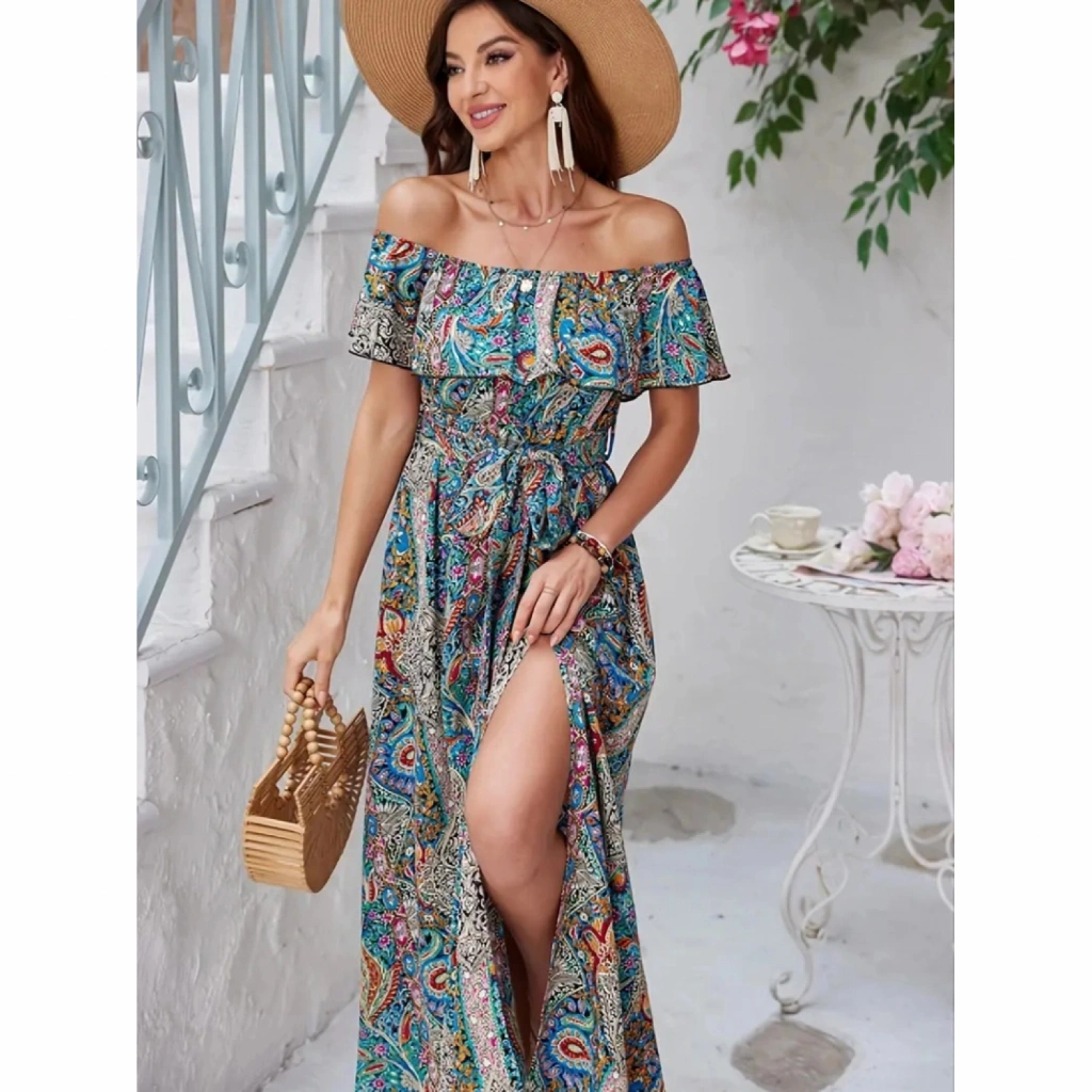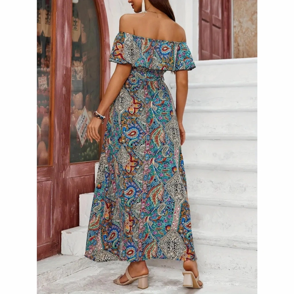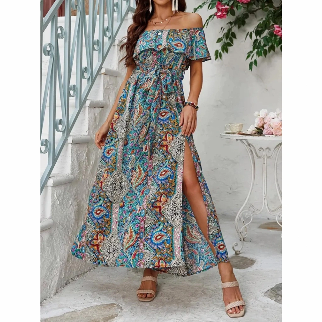 Kadın Kısa Kollu Madonna Yaka Fırfırlı Belden Yırtmaçlı Maksi Süprem Elbise