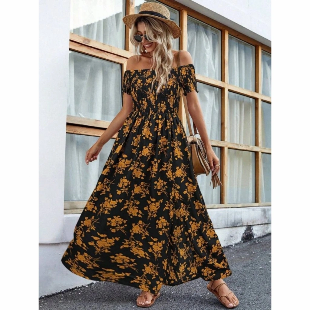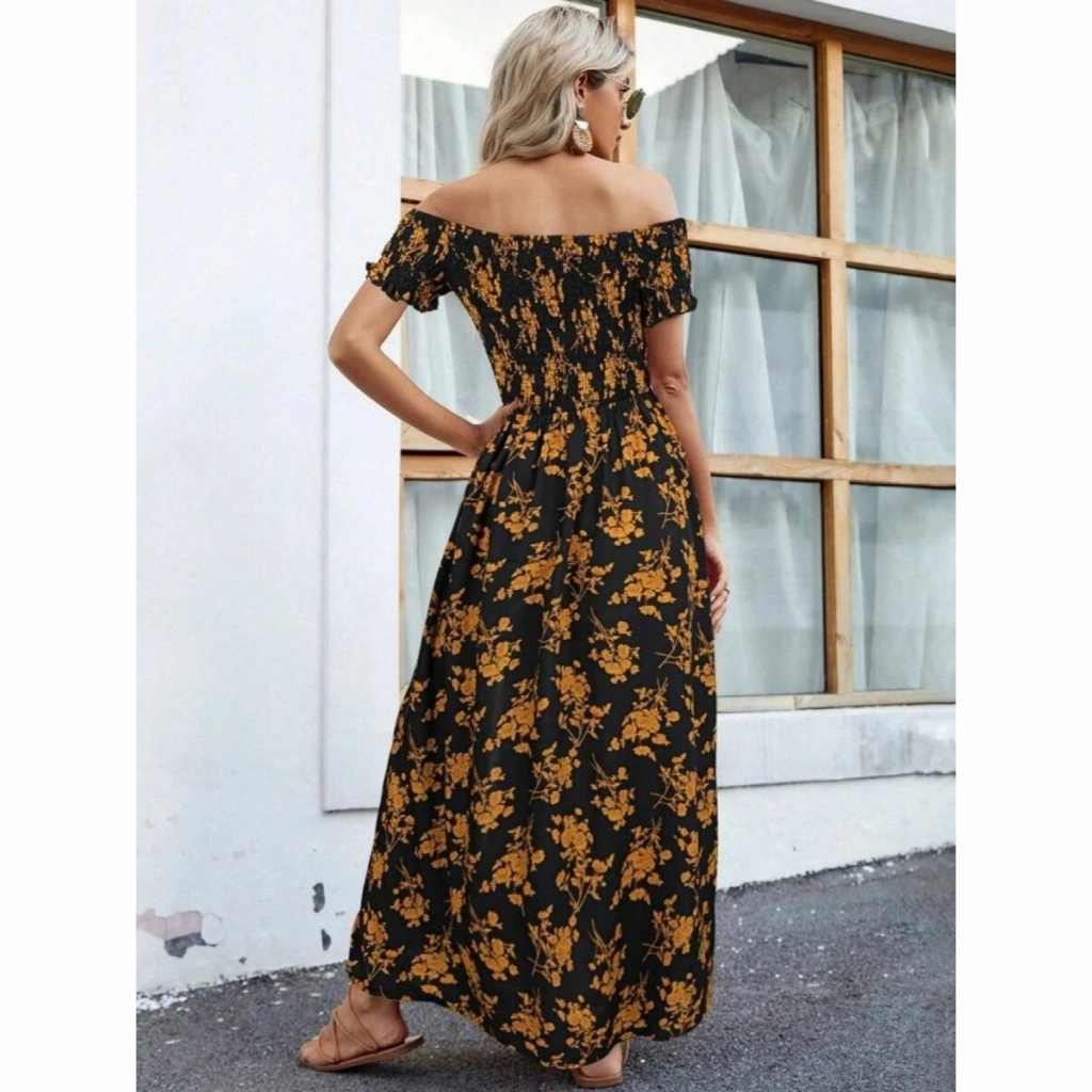 Kadın Kısa Kollu Madonna Yaka Yırtmaçlı çiçek Desenli Süprem Elbise