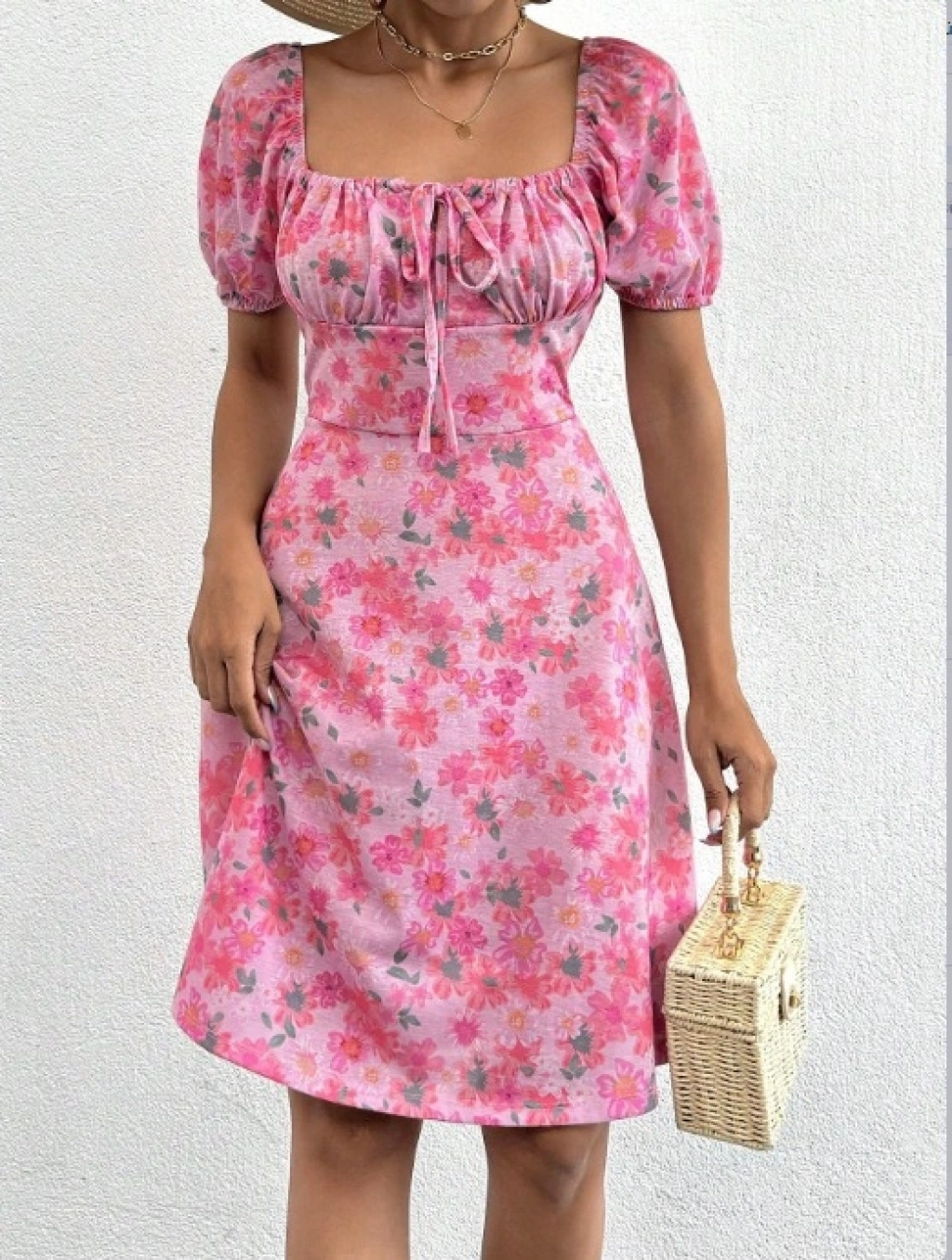 Kadın Kısa Kollu Mini çiçek Baskılı Bağcık Detay Süprem Midi Boy Elbise