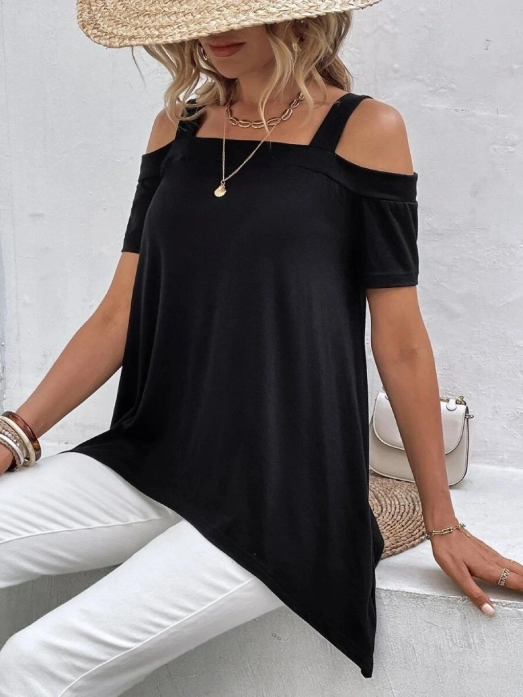 Kadın Kısa Kollu Omuzlardan Açık Askılı Asimetrik Kesim Viskon Bluz