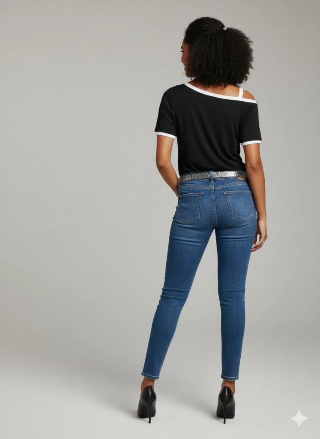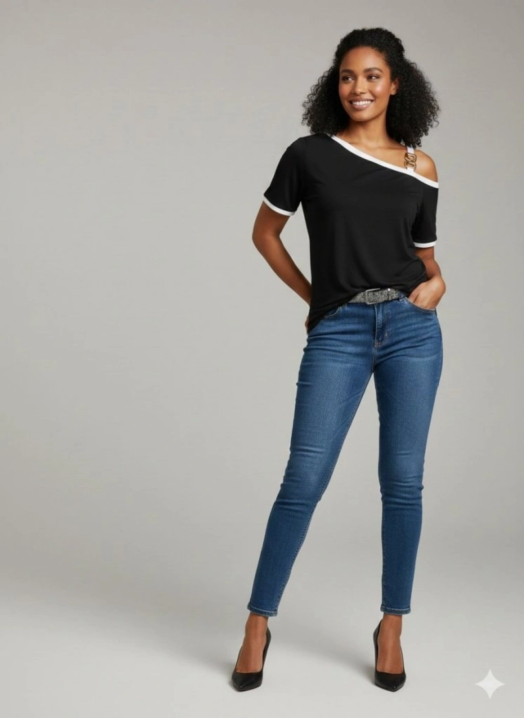 Kadın Kısa Kollu Tek Omuzu Açık Askı Toka Detaylı Viskon Bluz