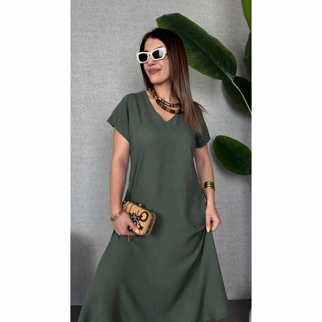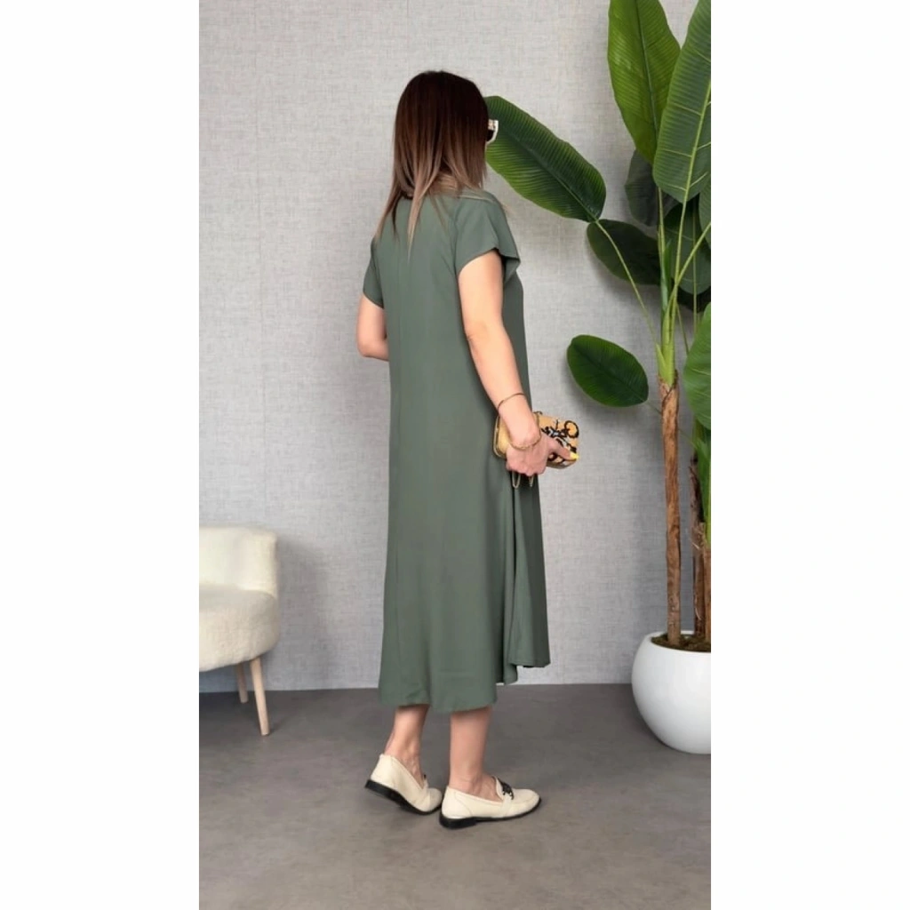 Kadın Kısa Kollu V Yaka Salaş Maxi Boy Elbise