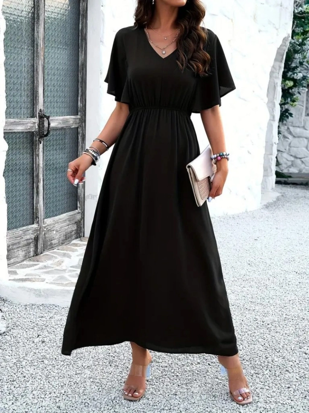 Kadın Kısa Kollu V Yakalı Beli Lastikli Uzun Viskon Elbise