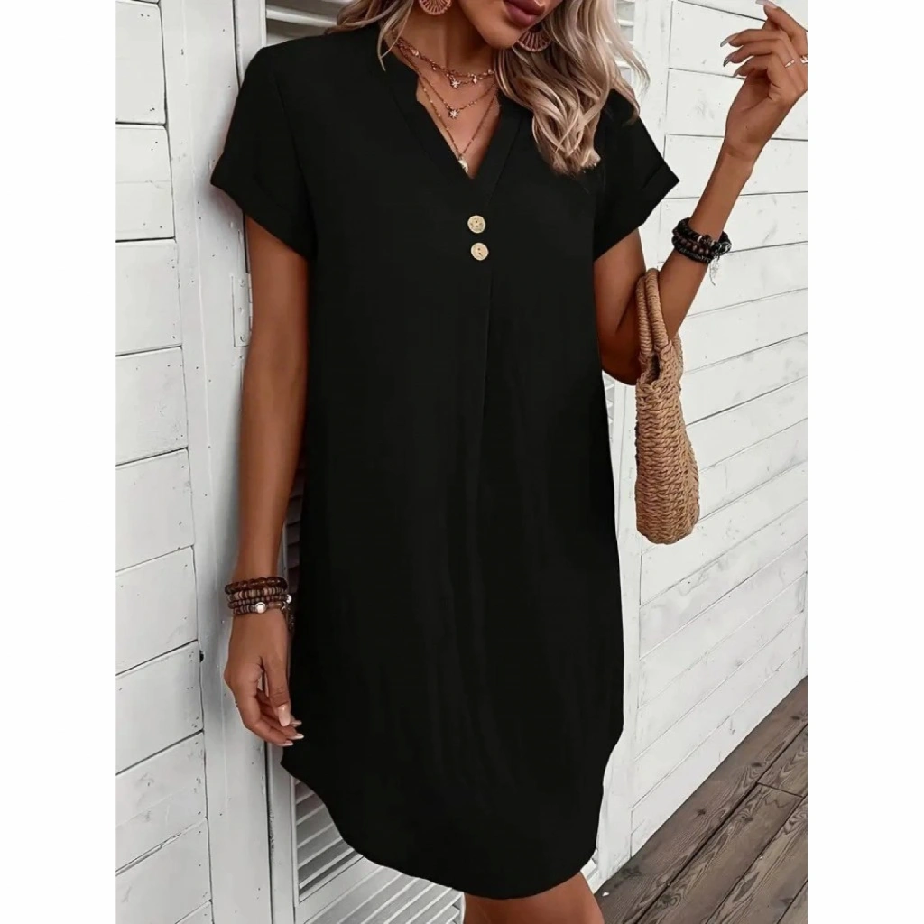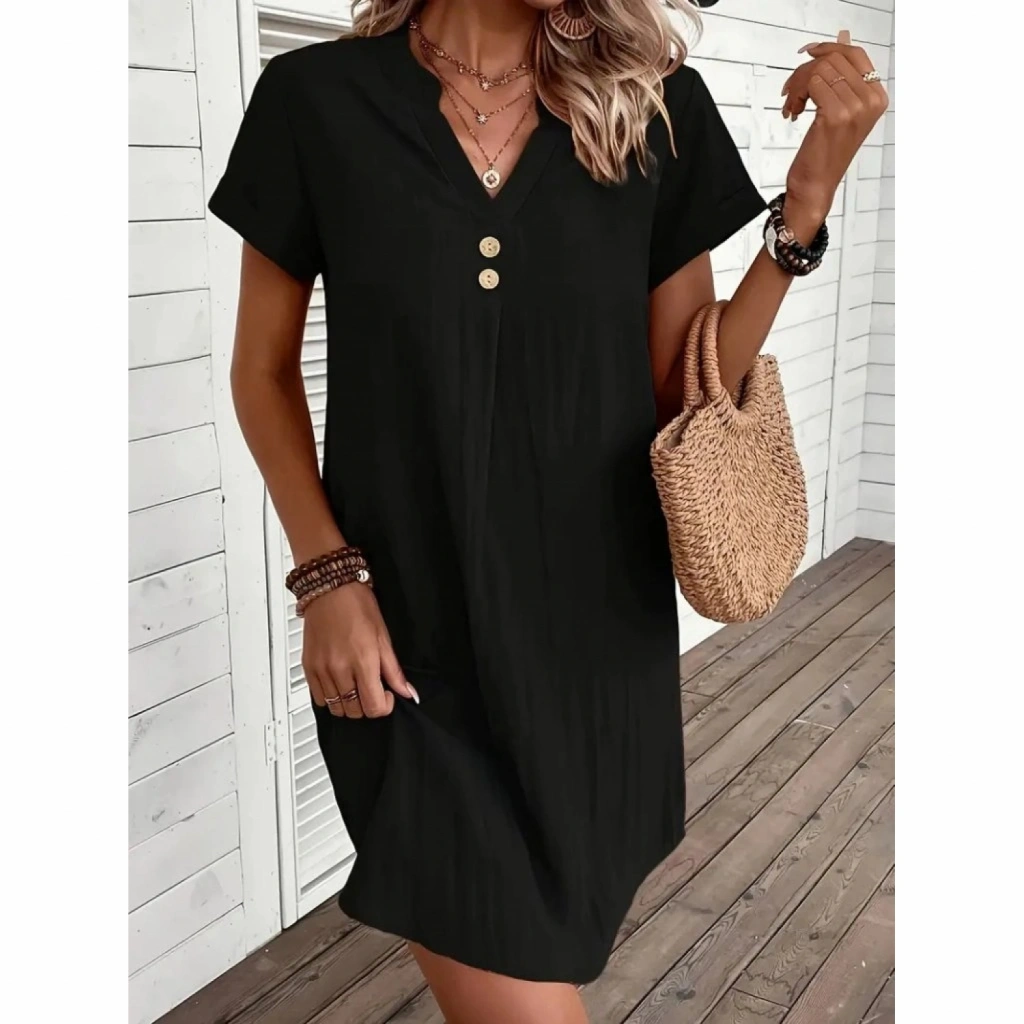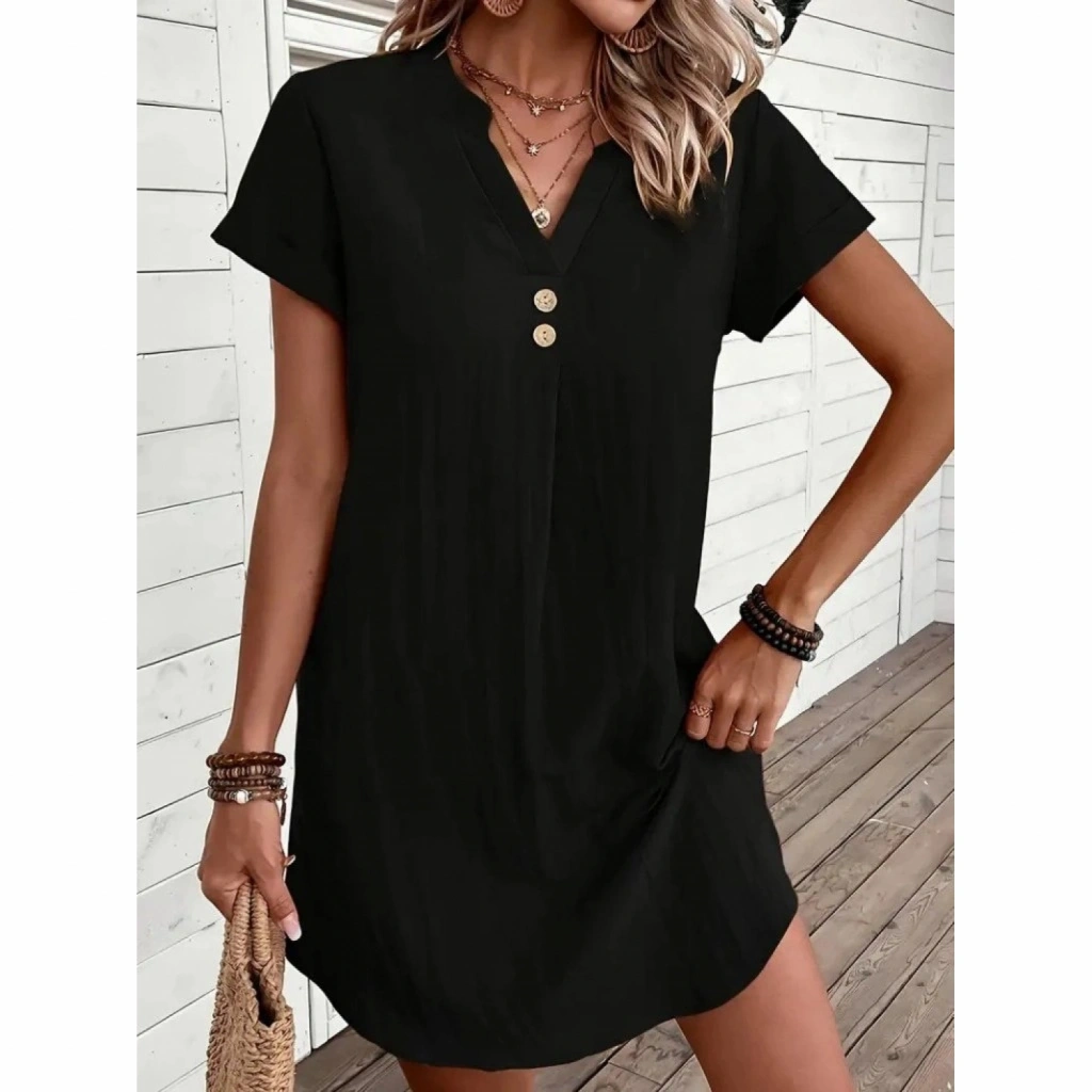 Kadın Kısa Kollu V Yakalı Düğmeli Müslim Kısa Elbise