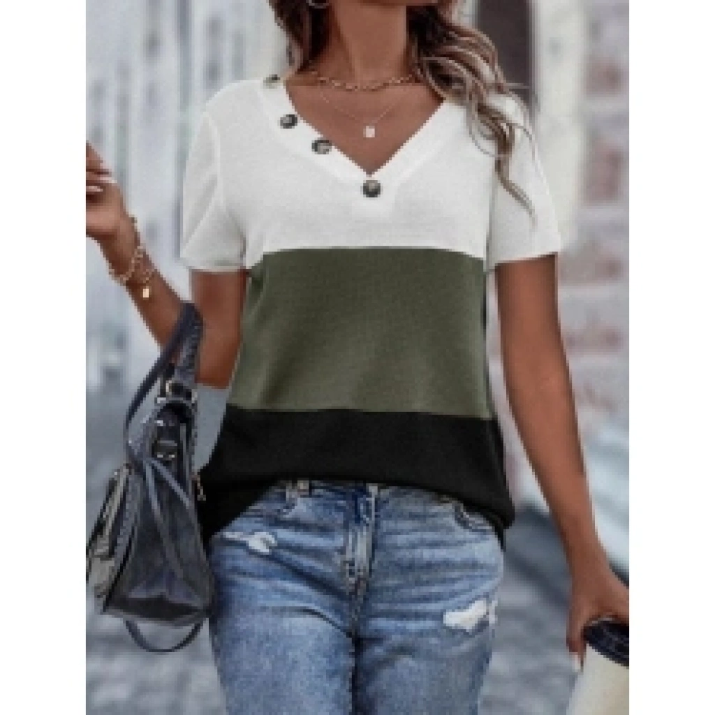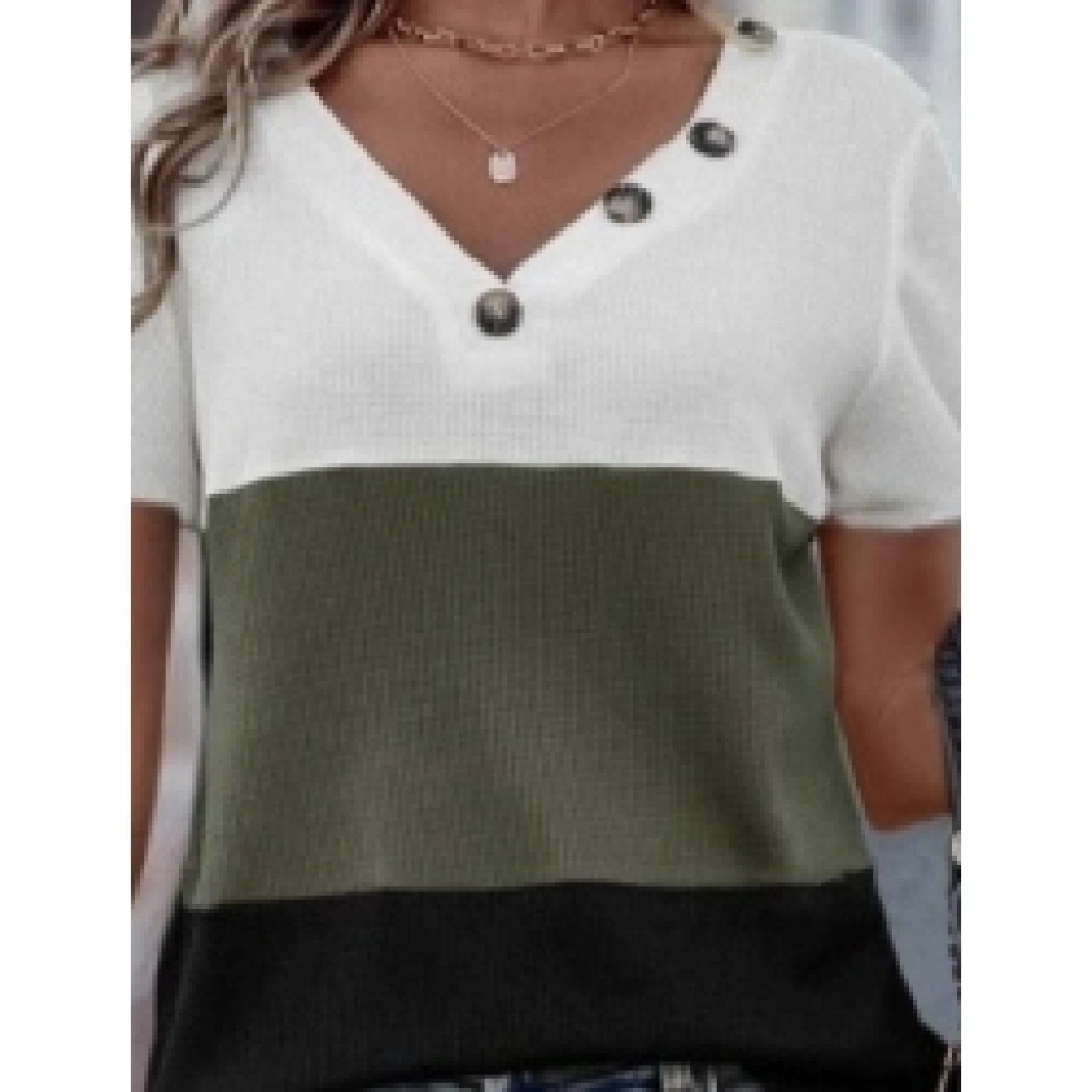 Kadın Kısa Kollu V Yakalı Düğmeli Waffle Bluz