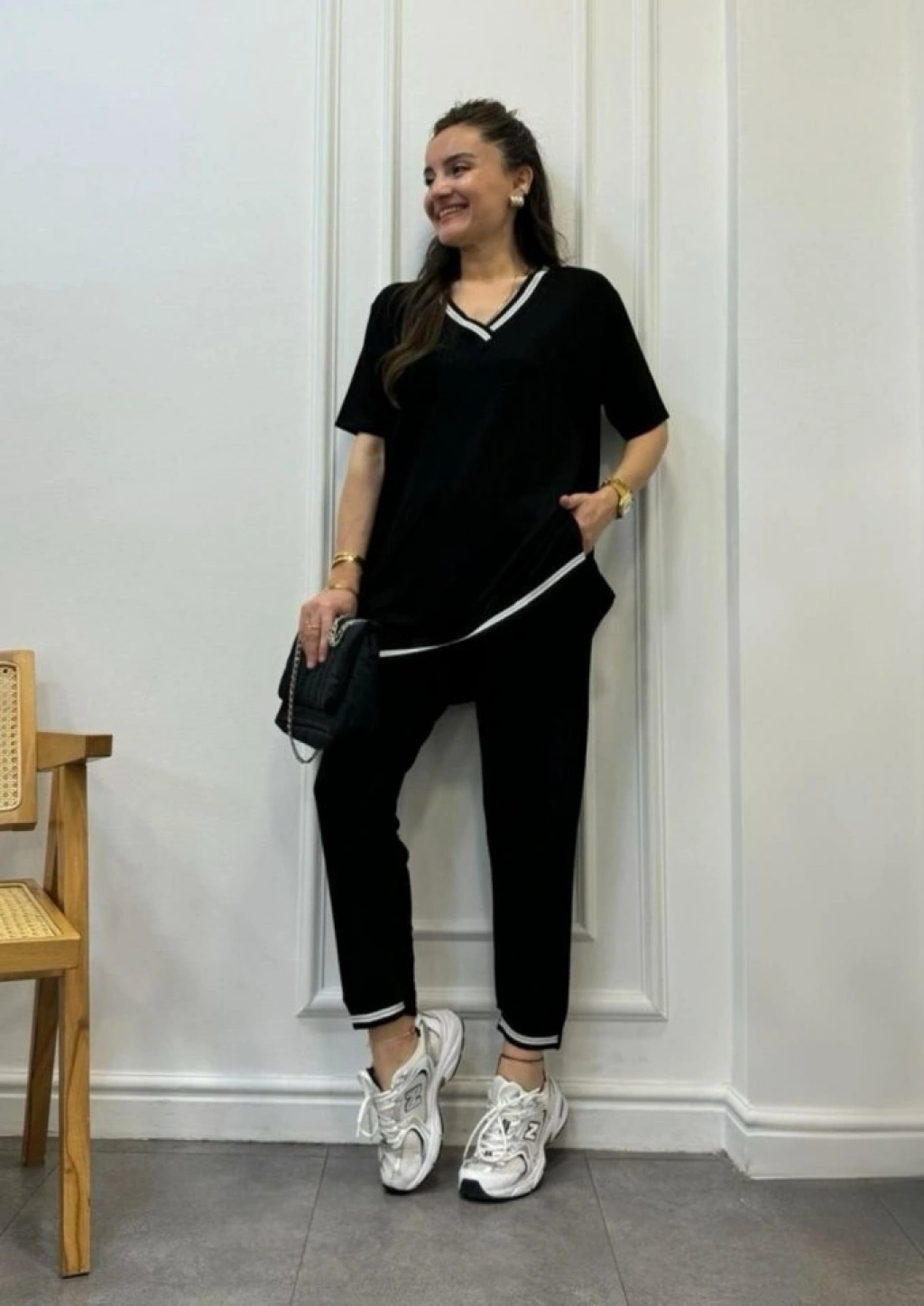 Kadın Kısa Kollu V Yakalı Iki Iplik Bluz Ve Pantolon Ikili Takım