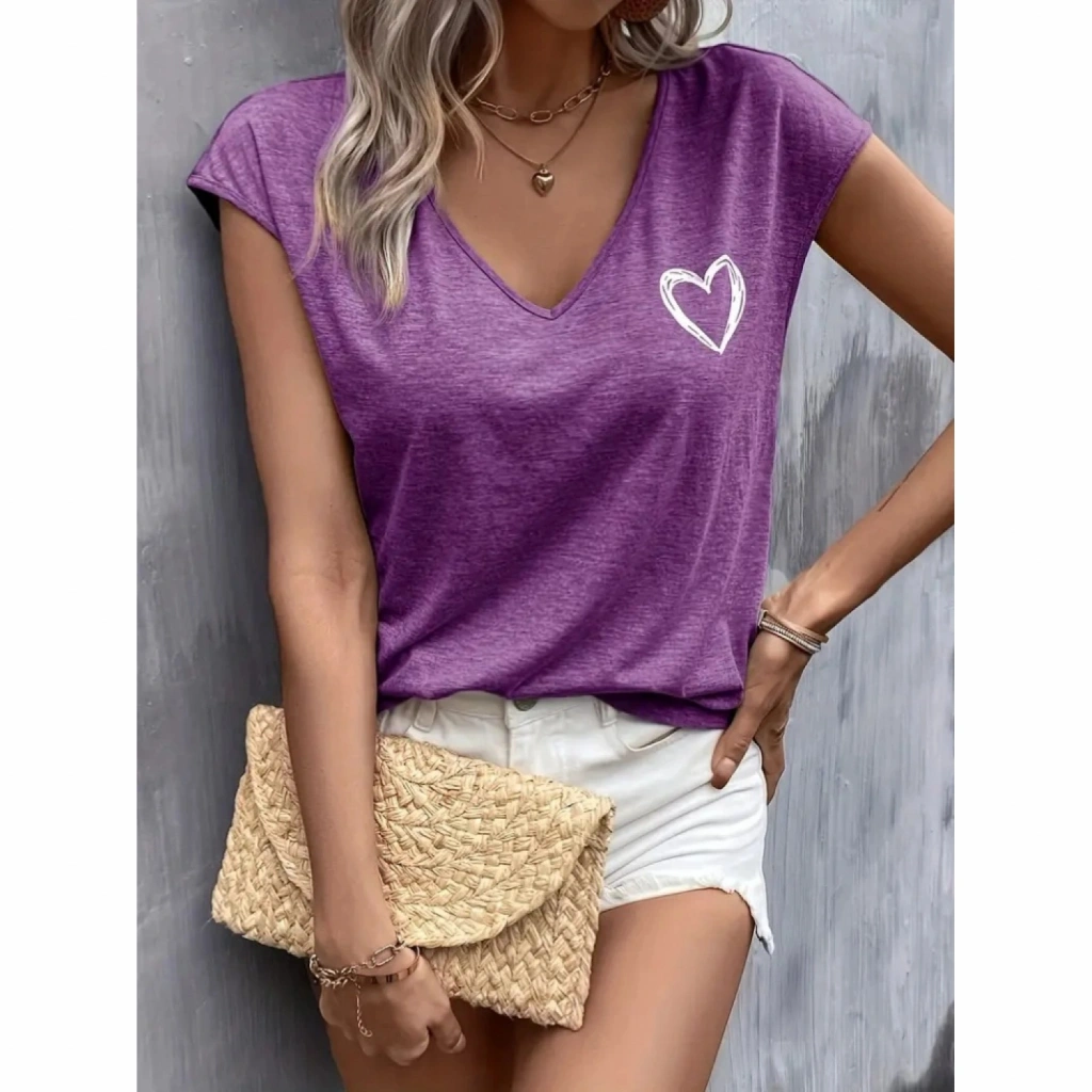 Kadın Kısa Kollu V Yakalı Kalp Baskılı Viskon Bluz