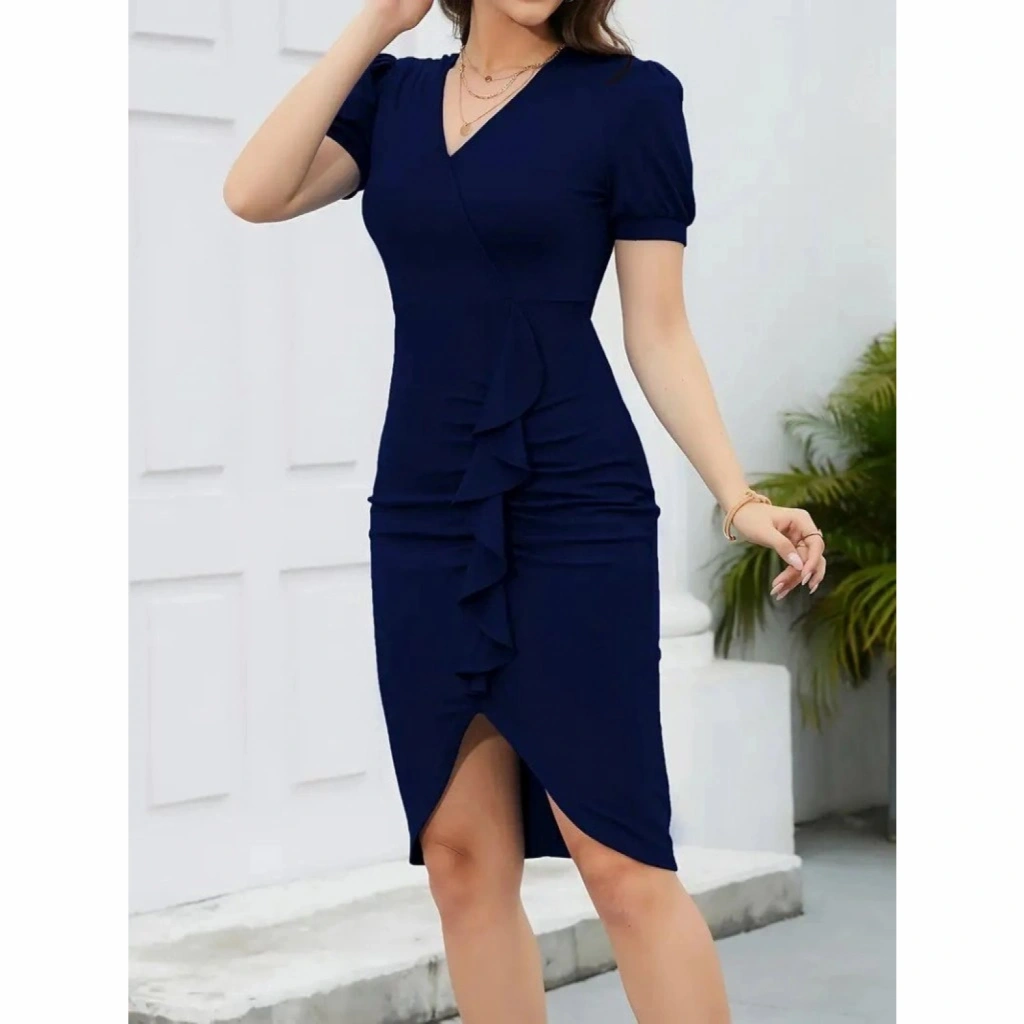 Kadın Kısa Kollu V Yakalı önden Fırfırlı Ithal Krep Elbise