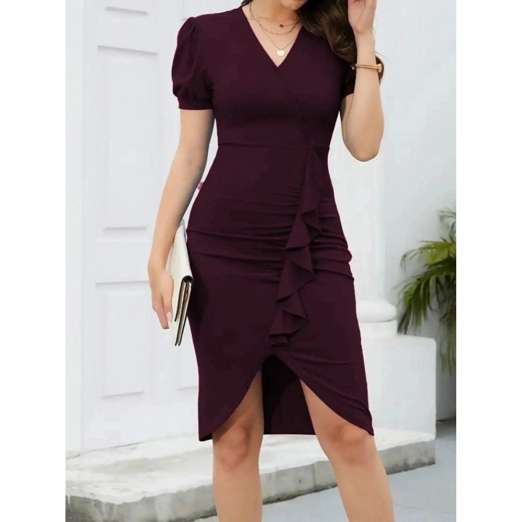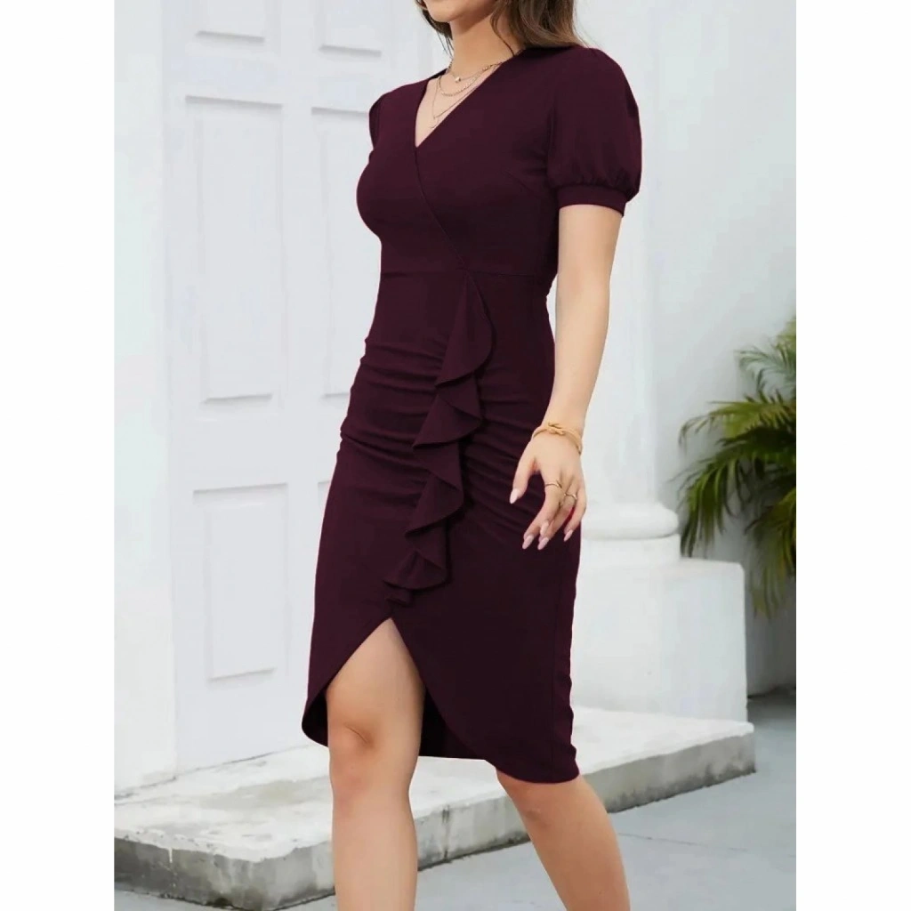 Kadın Kısa Kollu V Yakalı önden Fırfırlı Ithal Krep Elbise