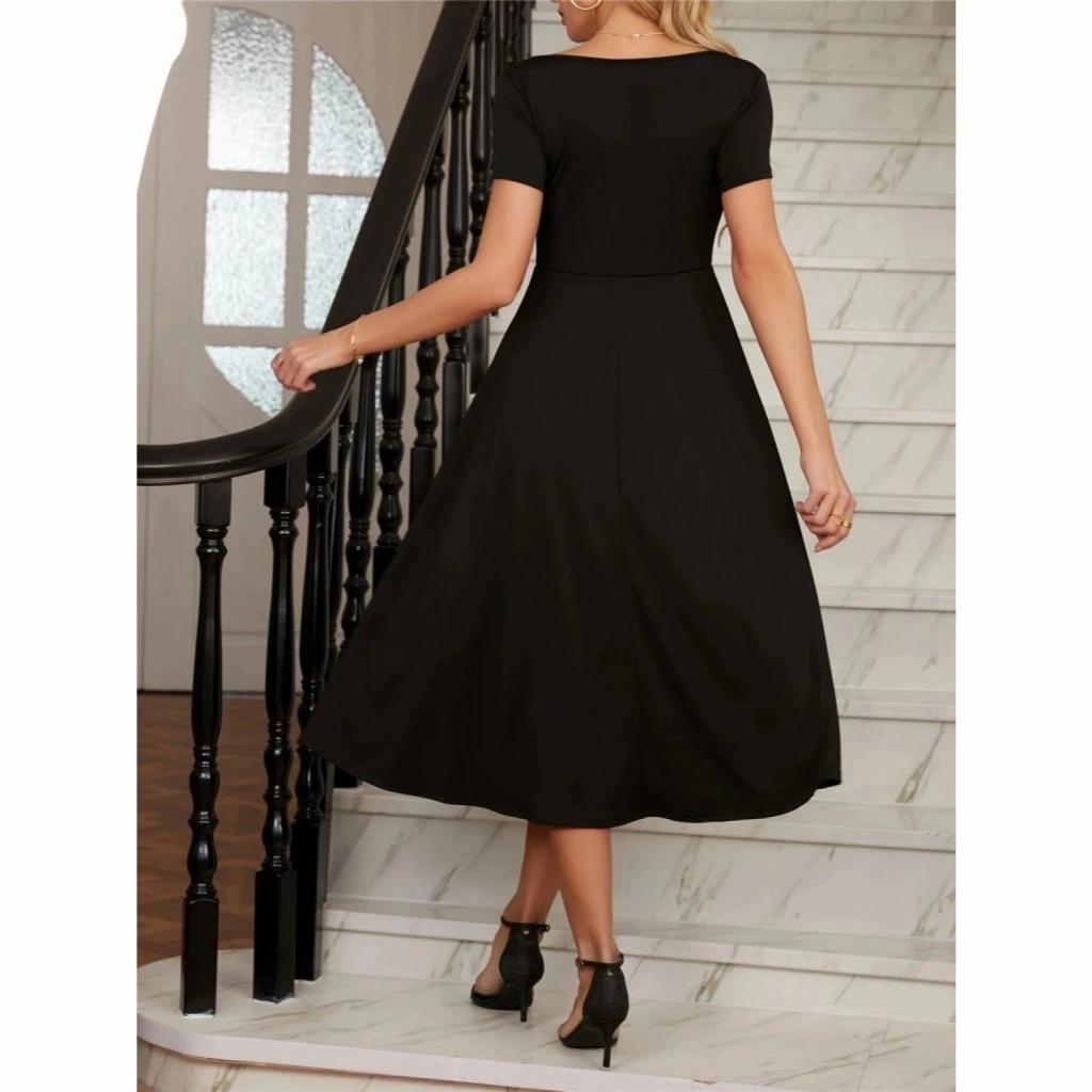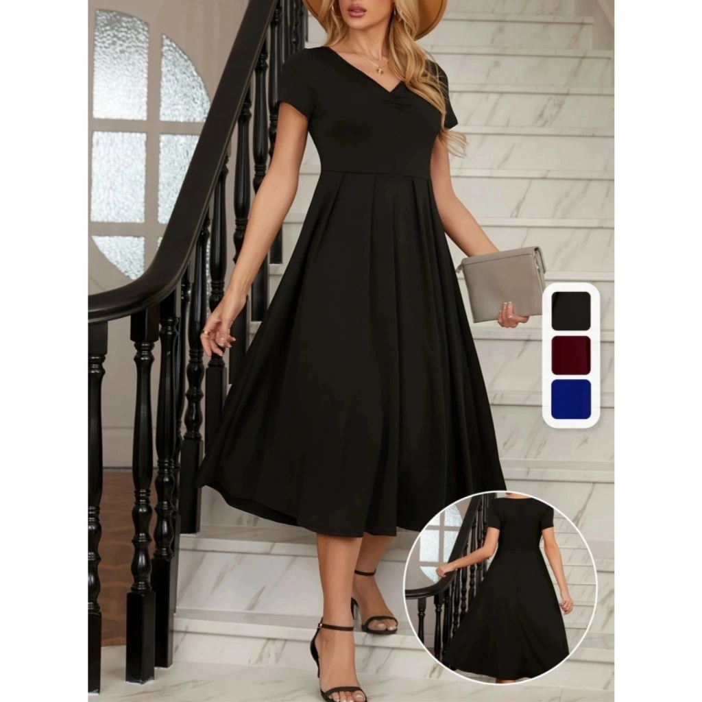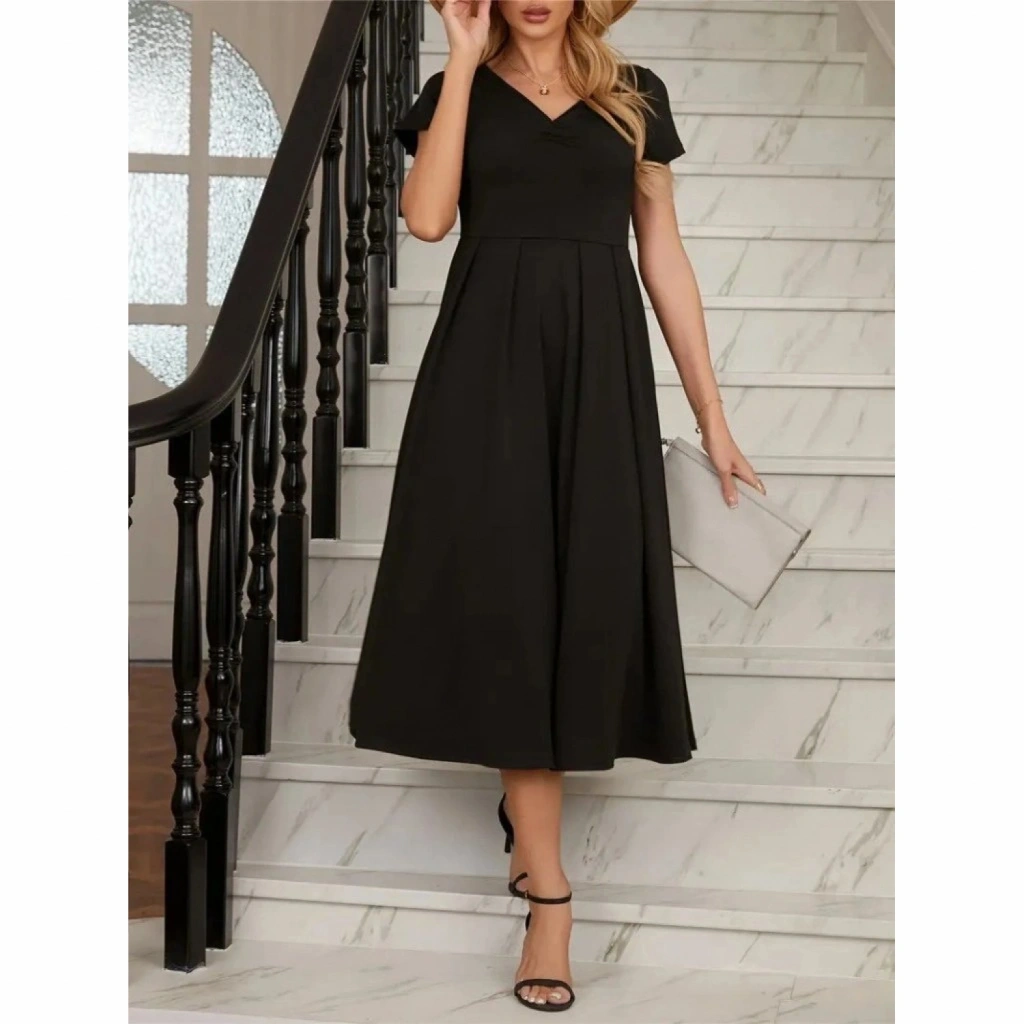 Kadın Kısa Kollu V Yakalı önden Pileli Midi Janjan Krep Elbise