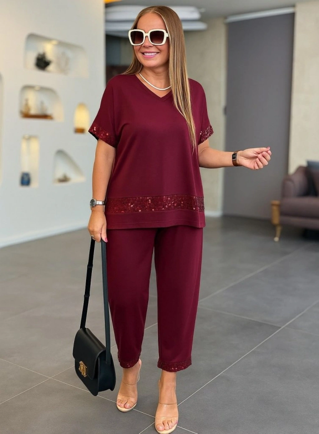 Kadın Kısa Kollu V Yakalı Pul Payetli Viskon Iki Iplik Bluz Ve Pantolon Ikili Takım