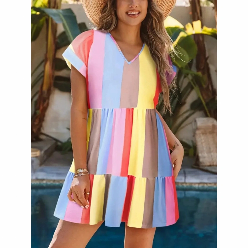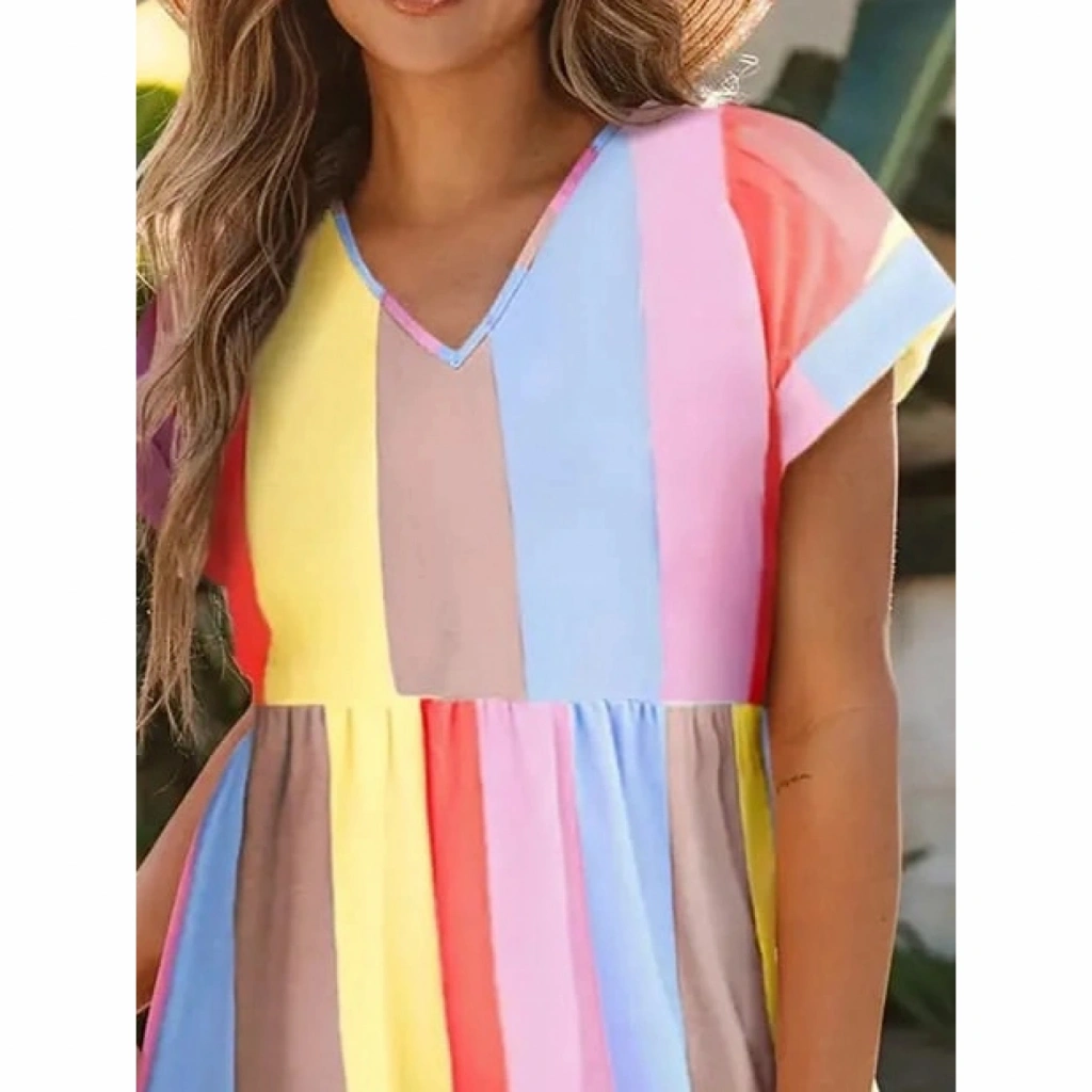 Kadın Kısa Kollu V Yakalı şerit Desenli Süprem Elbise