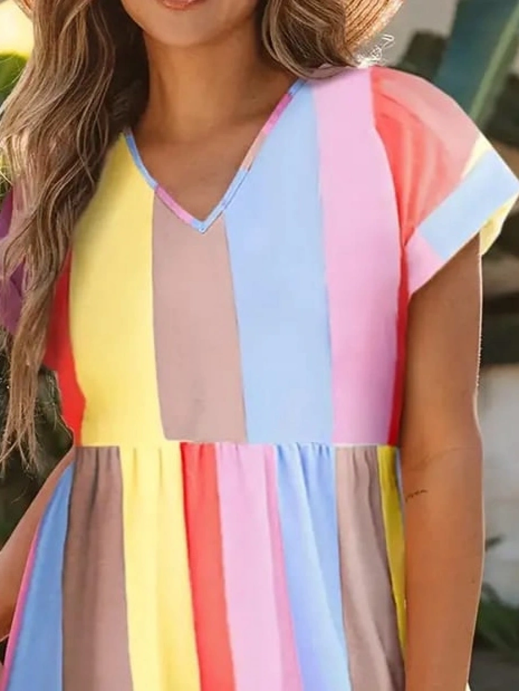 Kadın Kısa Kollu V Yakalı şerit Desenli Süprem Elbise