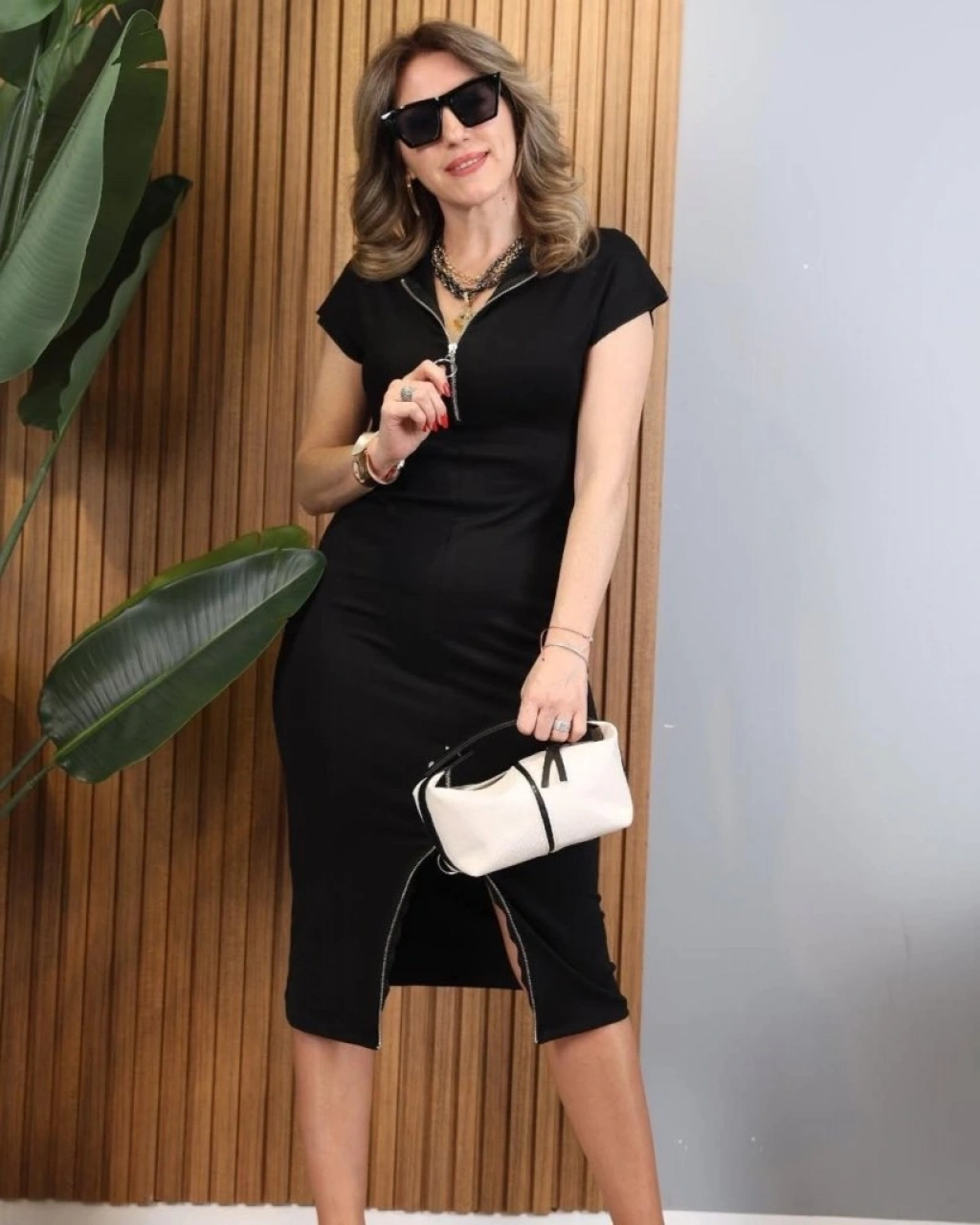 Kadın Kısa Kollu Yakadan Ve Eteği Fermuarlı Viskon Iki Iplik Midi Elbise