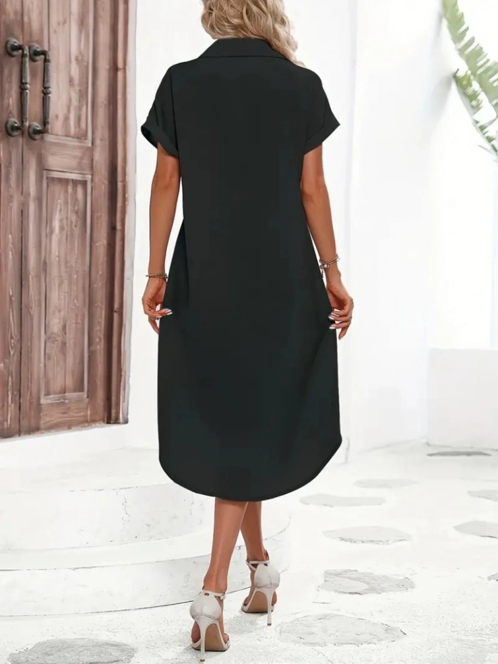 Kadın Kısa Kollu Yakalı Düğme Detay Midi Dokuma Elbise
