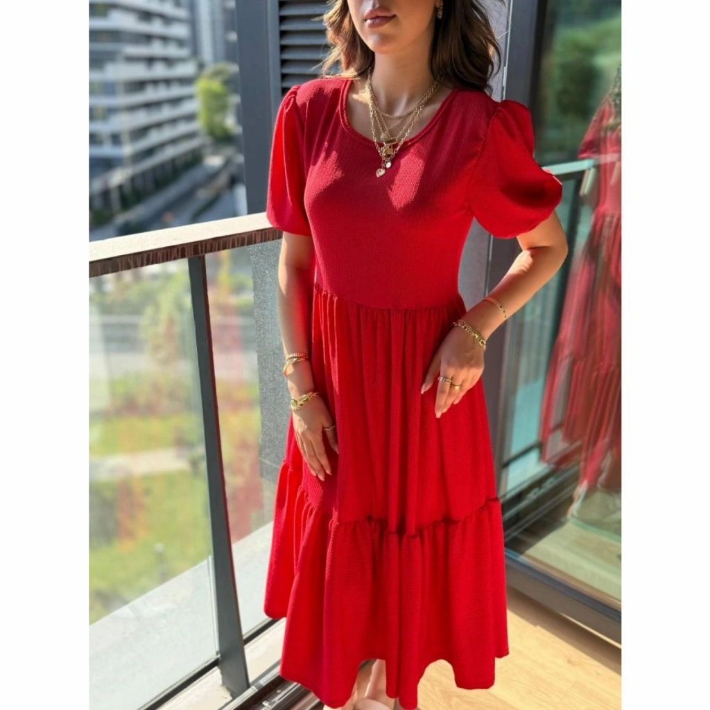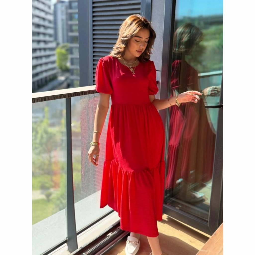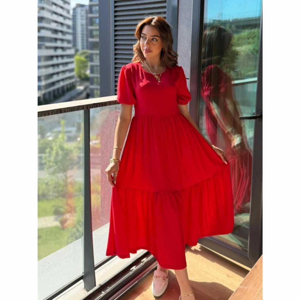 Kadın Kısa Kollu Yakası Açık Katlı Bürümcük Balon Elbise