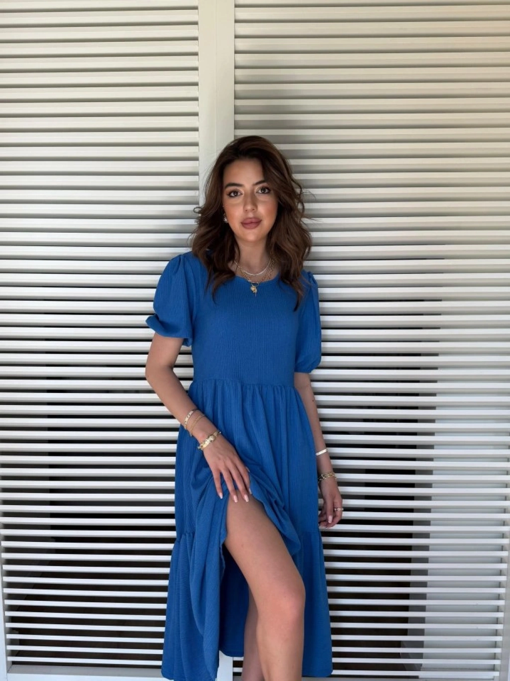 Kadın Kısa Kollu Yakası Açık Katlı Bürümcük Balon Elbise