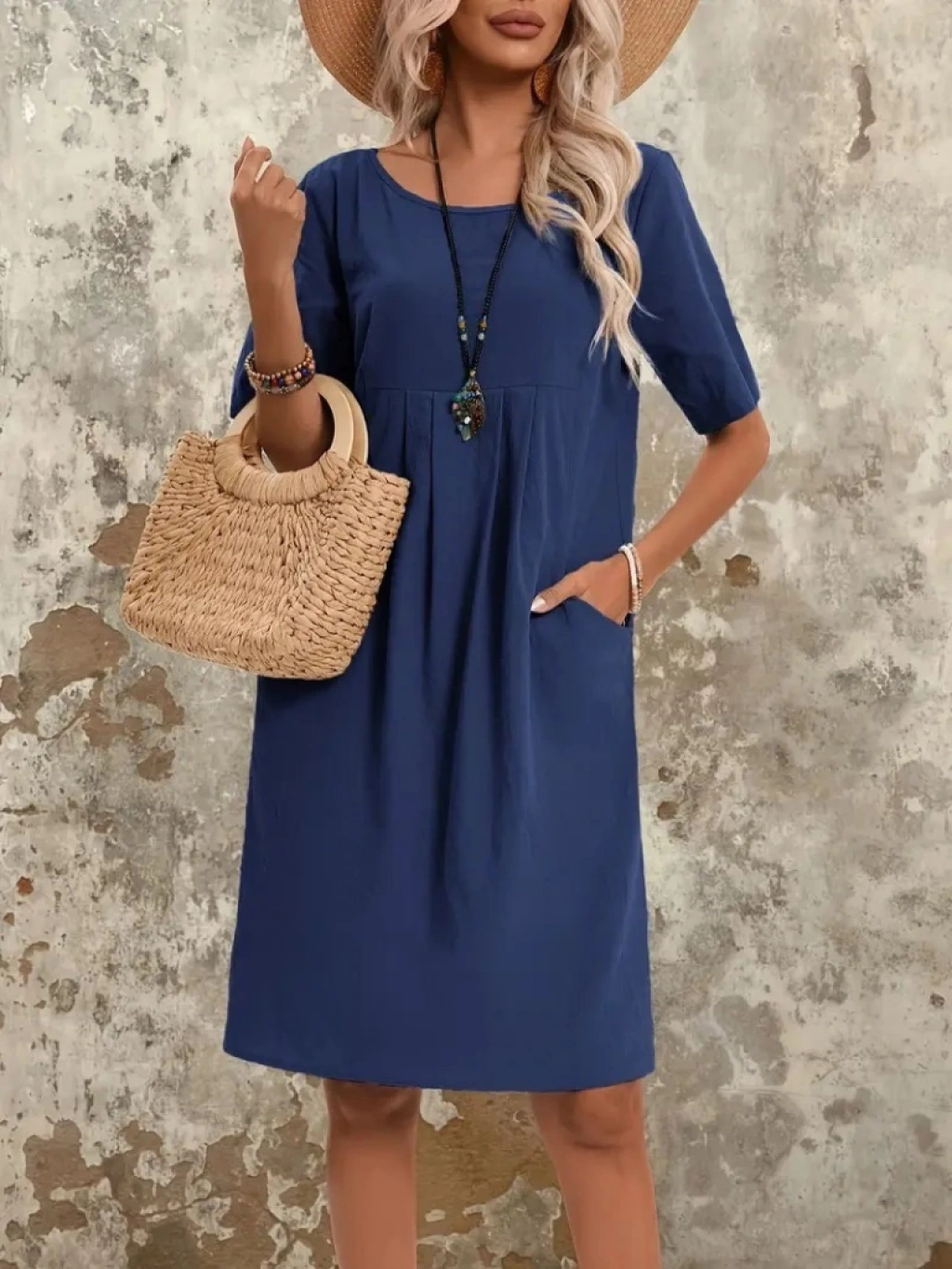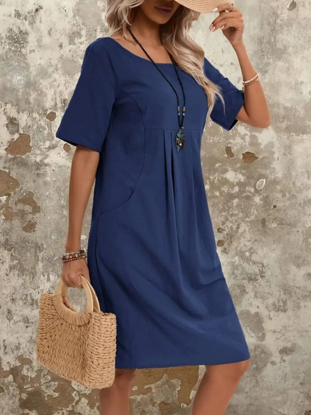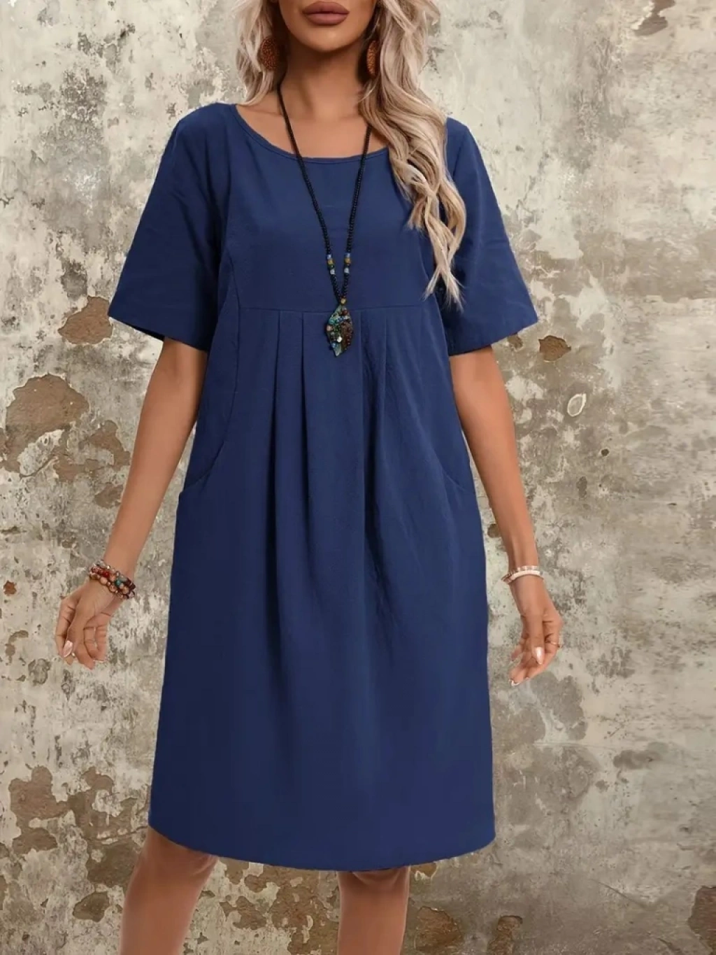 Kadın Kısa Kollu Yakası Açık önden Büzgülü Cep Detaylı Viskon Iki Iplik Elbise