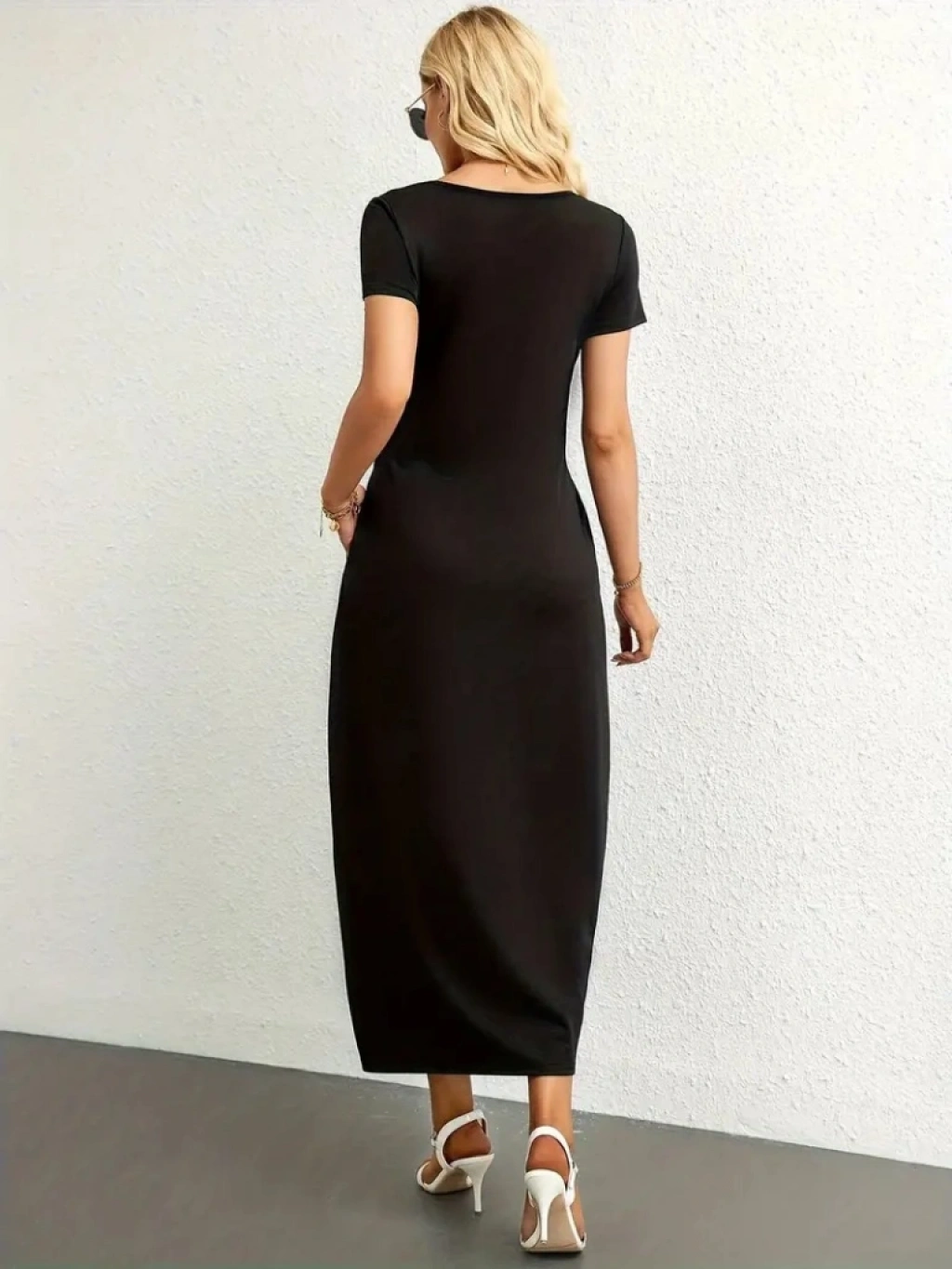 Kadın Kısa Kollu Yakası Yuvarlak Cepli Viskon Elbise
