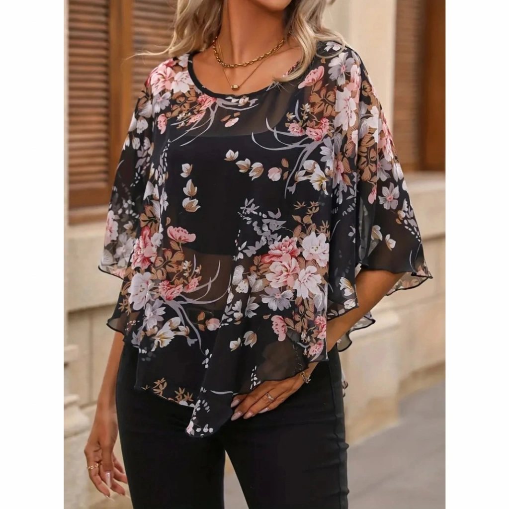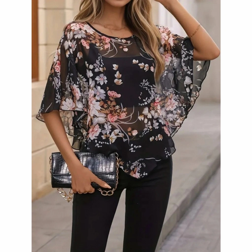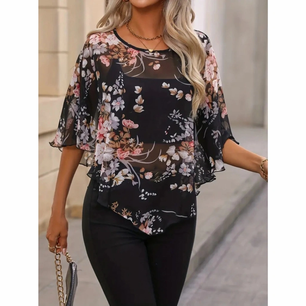 Kadın Kısa Kollu Yuvarlak Yaka çiçek Baskılı Asimetrik Kesim şifon Bluz