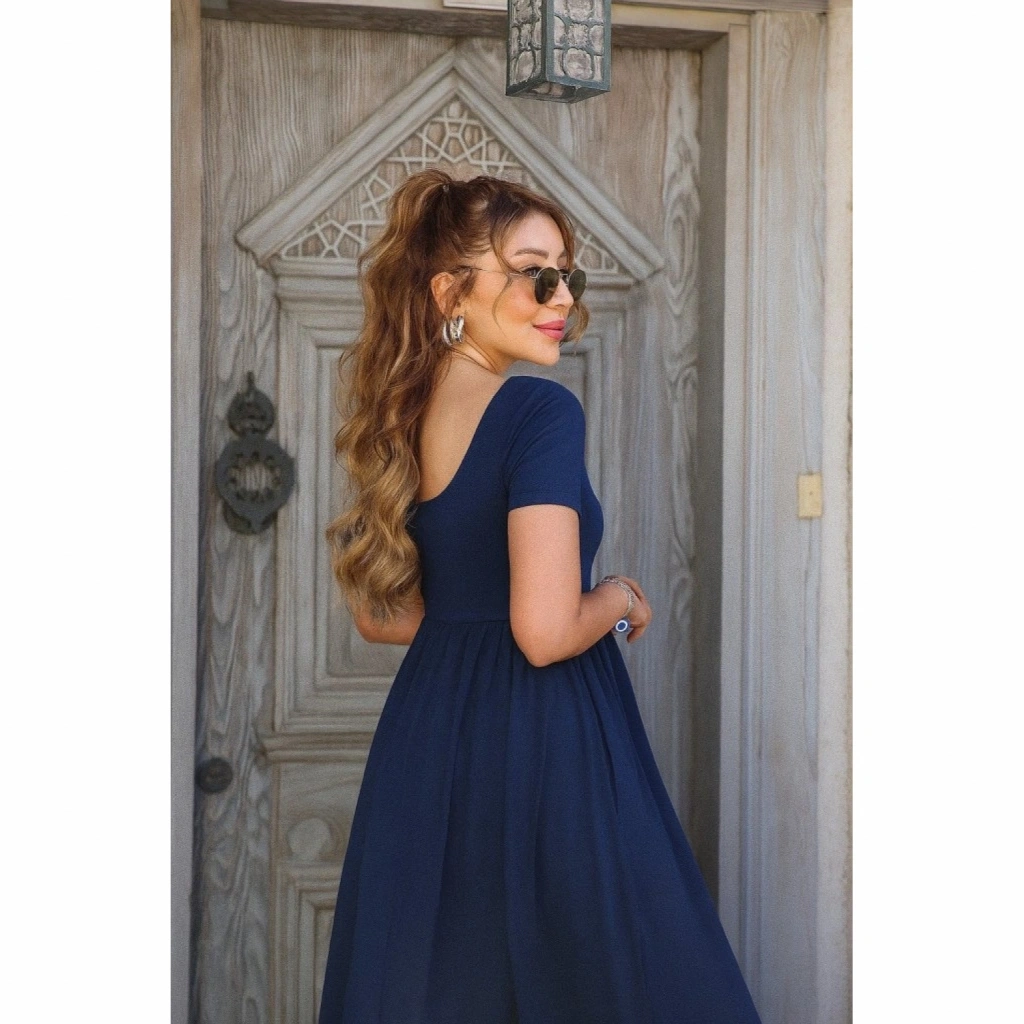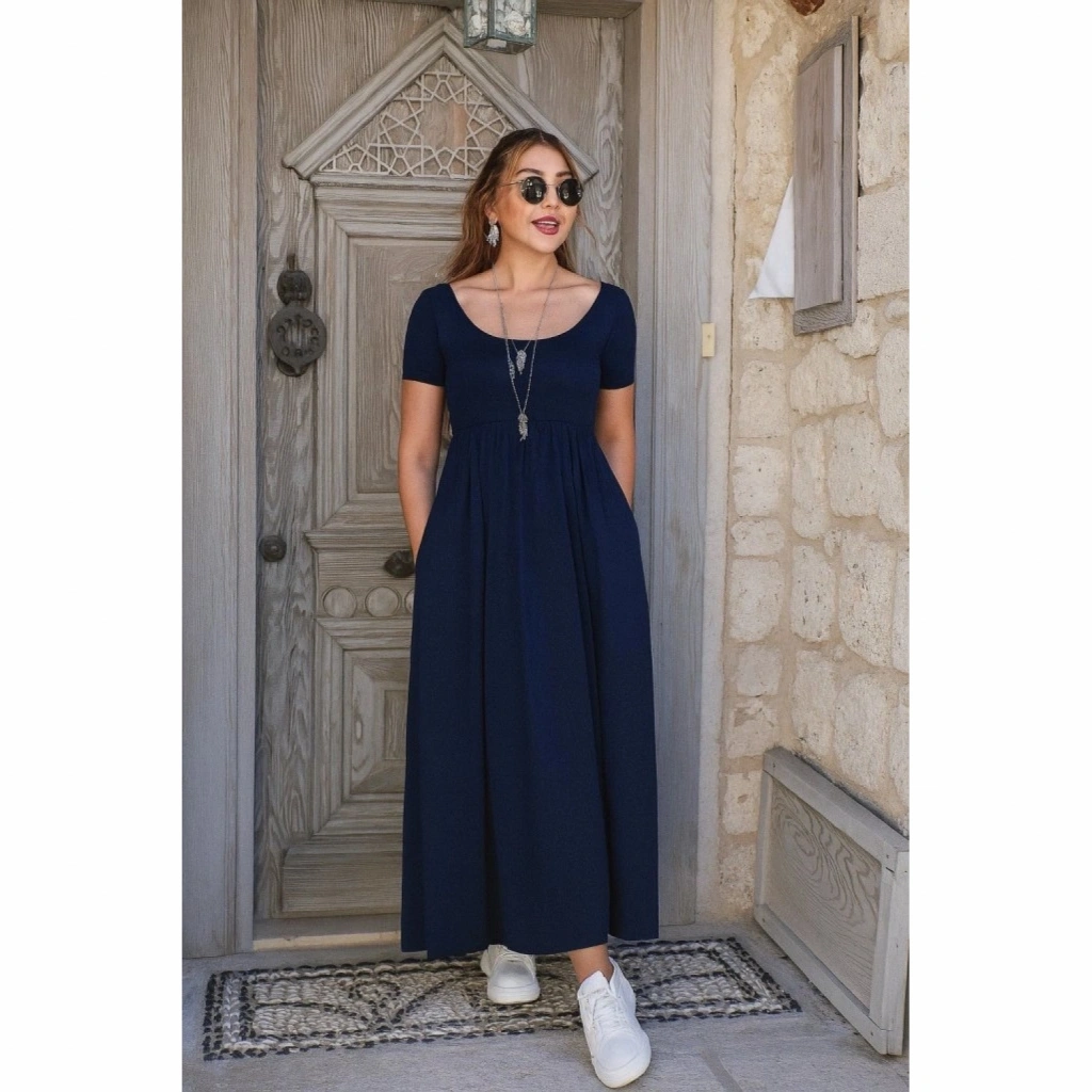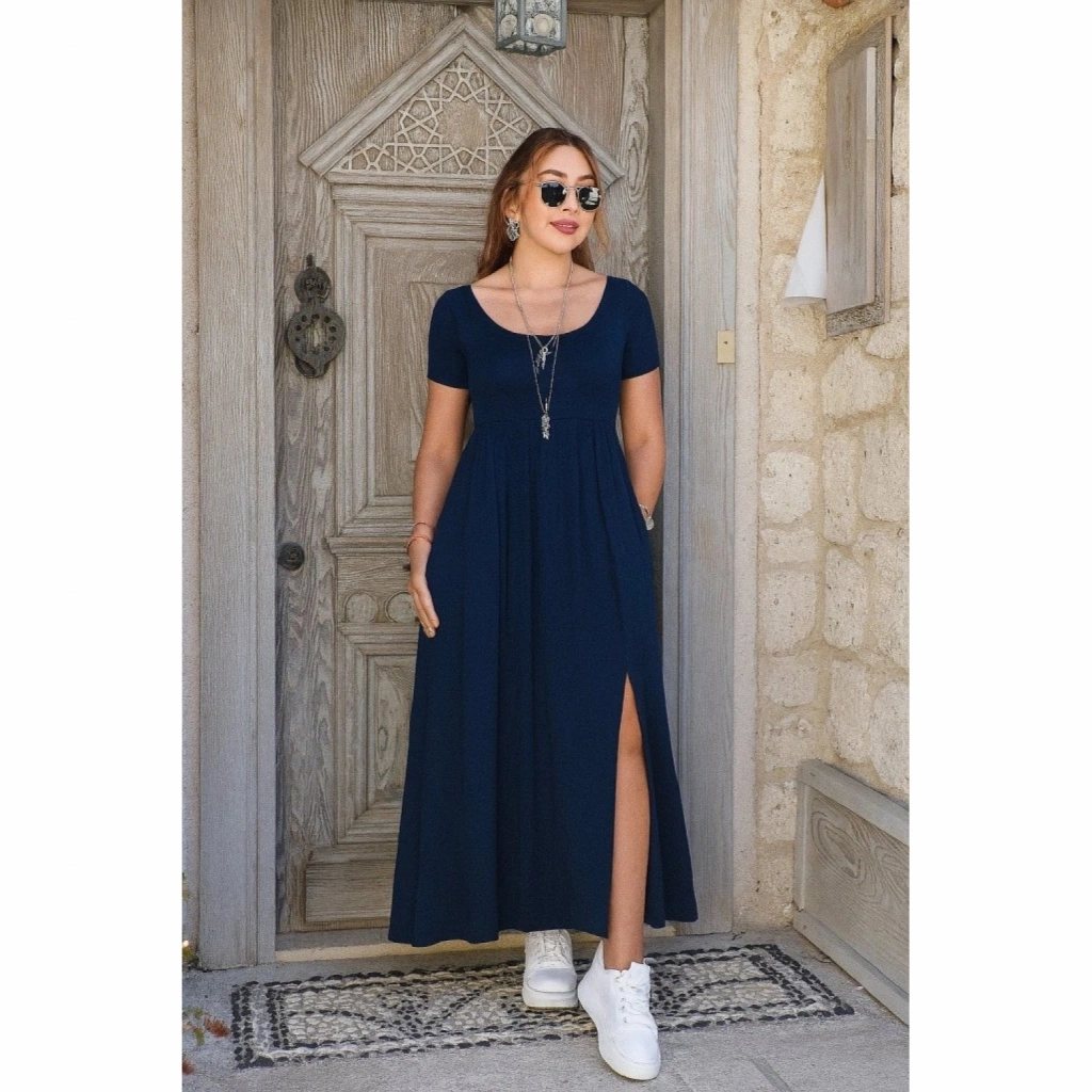 Kadın Kısa Kollu Yuvarlak Yaka önden Yırtmaçlı Cepli Viskon Uzun Elbise