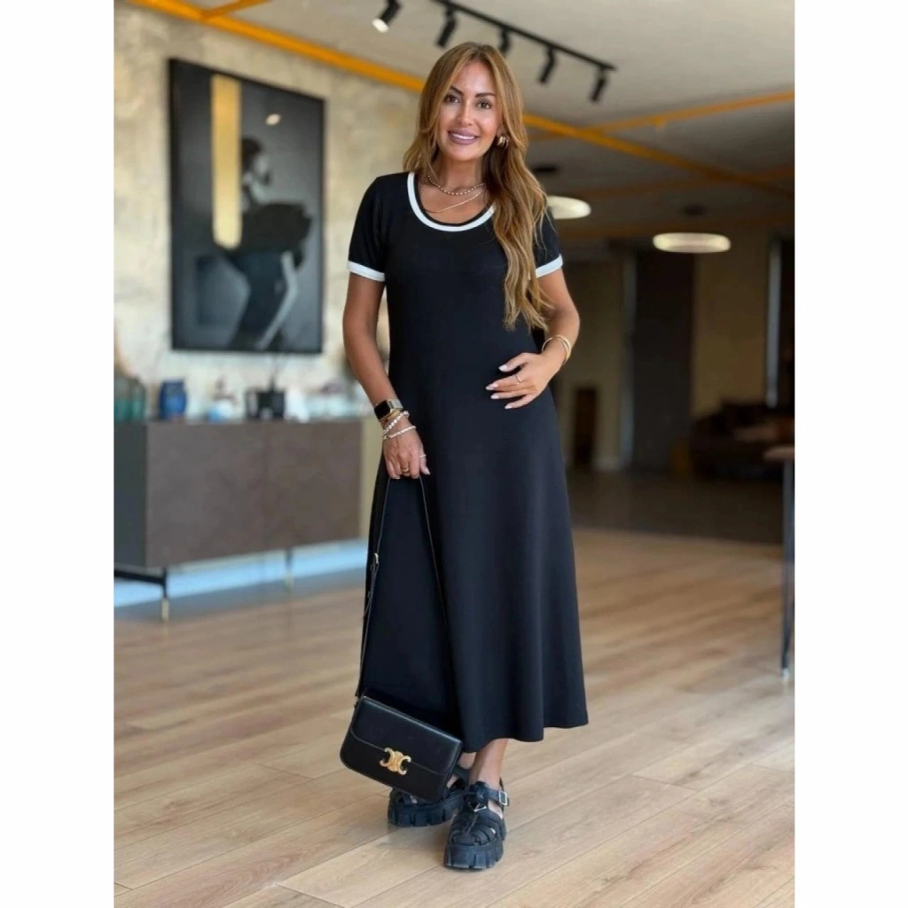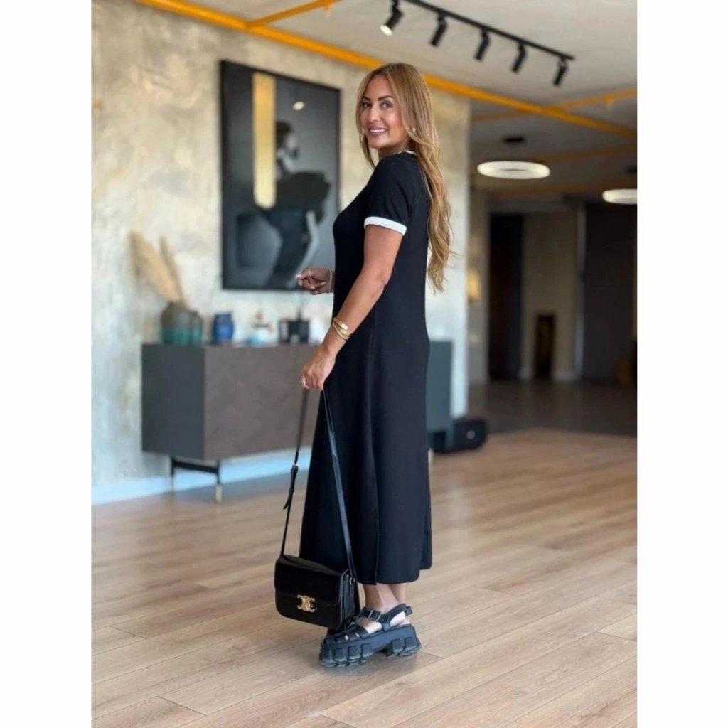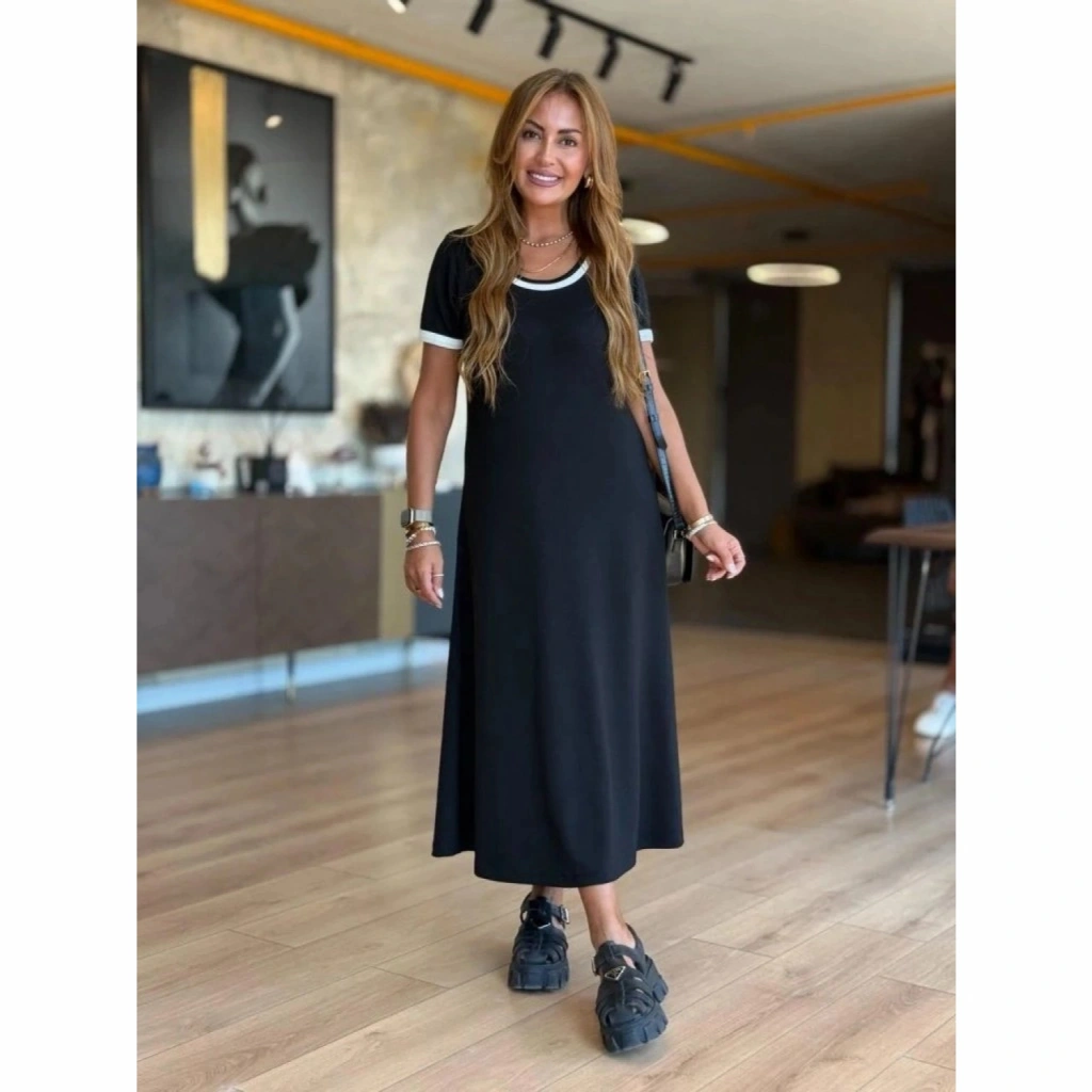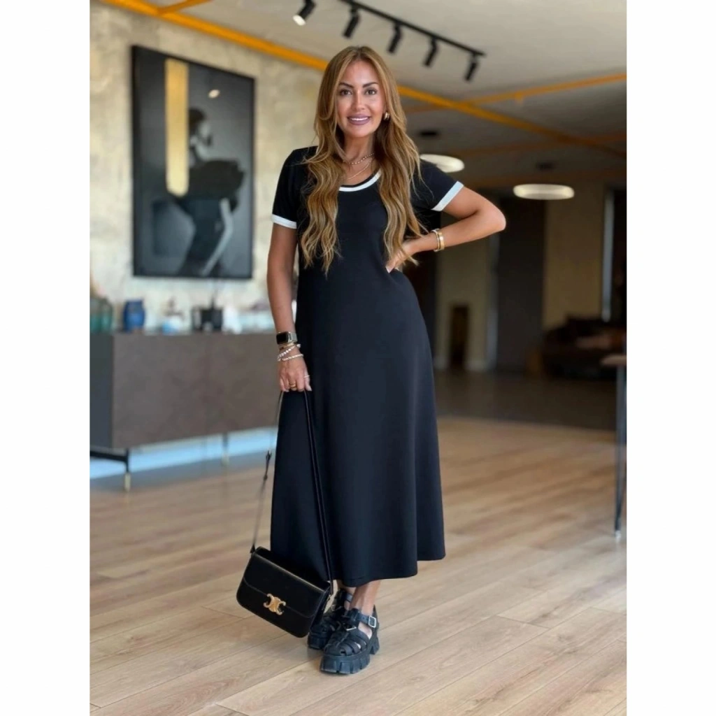 Kadın Kısa Kollu Yuvarlak Yaka Yandan Yırtmaçlı Midi Viskon Elbise