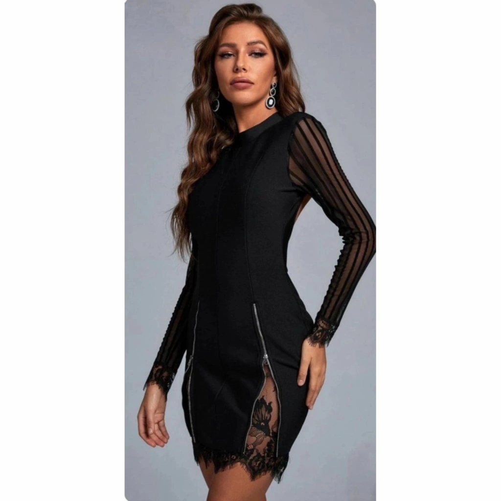Kadın Kolları Ve Etek Ucu Dantel Detay Fermuar Dekolteli Skuba Kumaş Mini Elbise