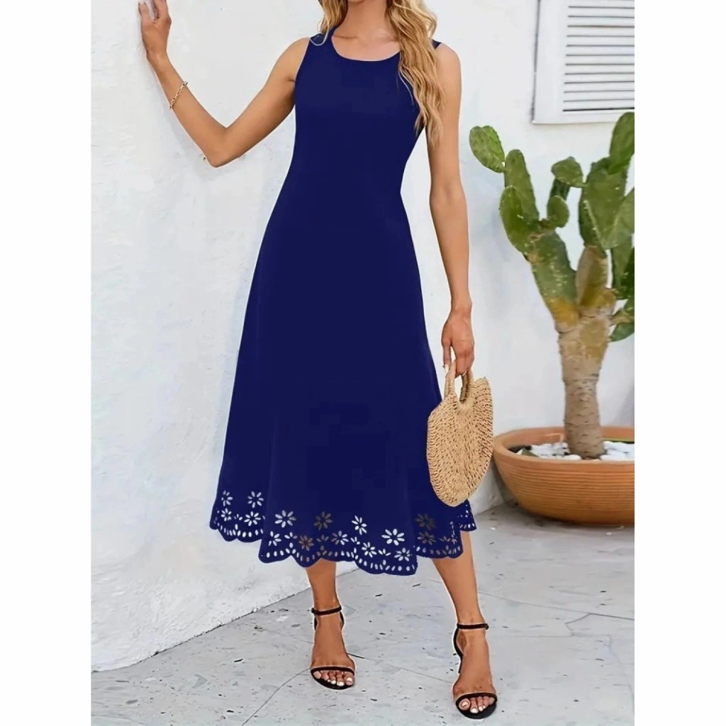 Kadın Kolsuz Etek Ucu Lazer Kesim çiçek Desenli Midi Boy Ithal Krep Elbise