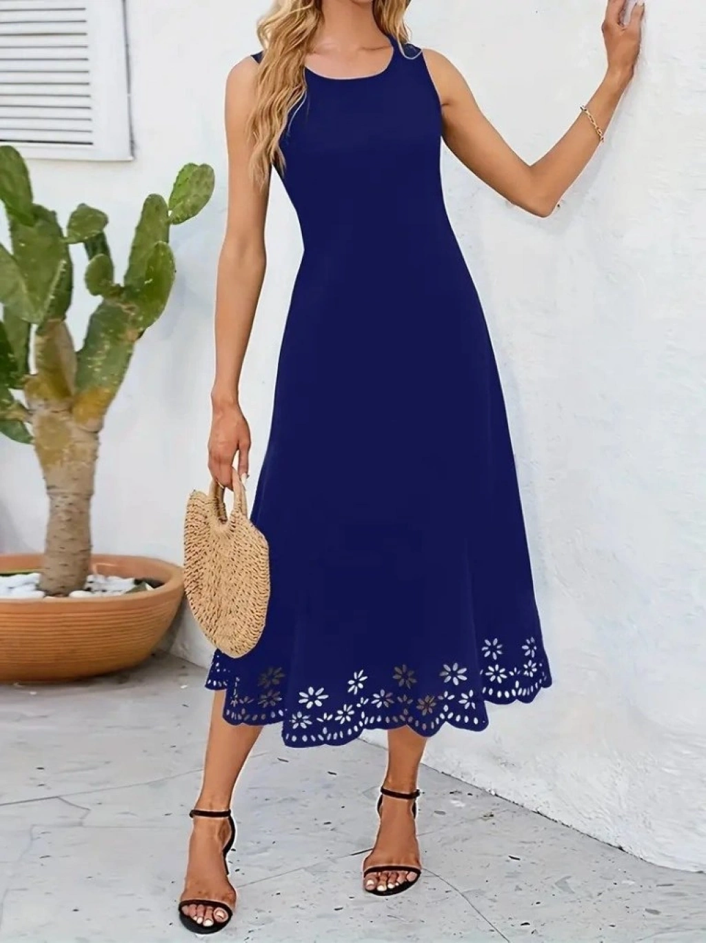 Kadın Kolsuz Etek Ucu Lazer Kesim çiçek Desenli Midi Boy Ithal Krep Elbise