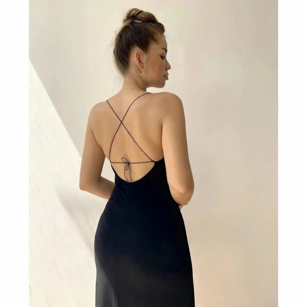 Kadın Kolsuz V Yaka Boyundan Ve Sırttan Bağlamalı Yırtmaçlı Janjan Krep Midi Elbise