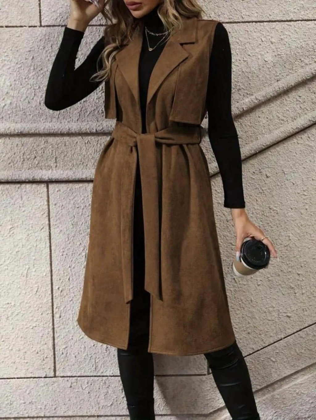 Kadın Kolsuz Yakalı önü Açık Belden Kuşaklı Süet Midi Yelek