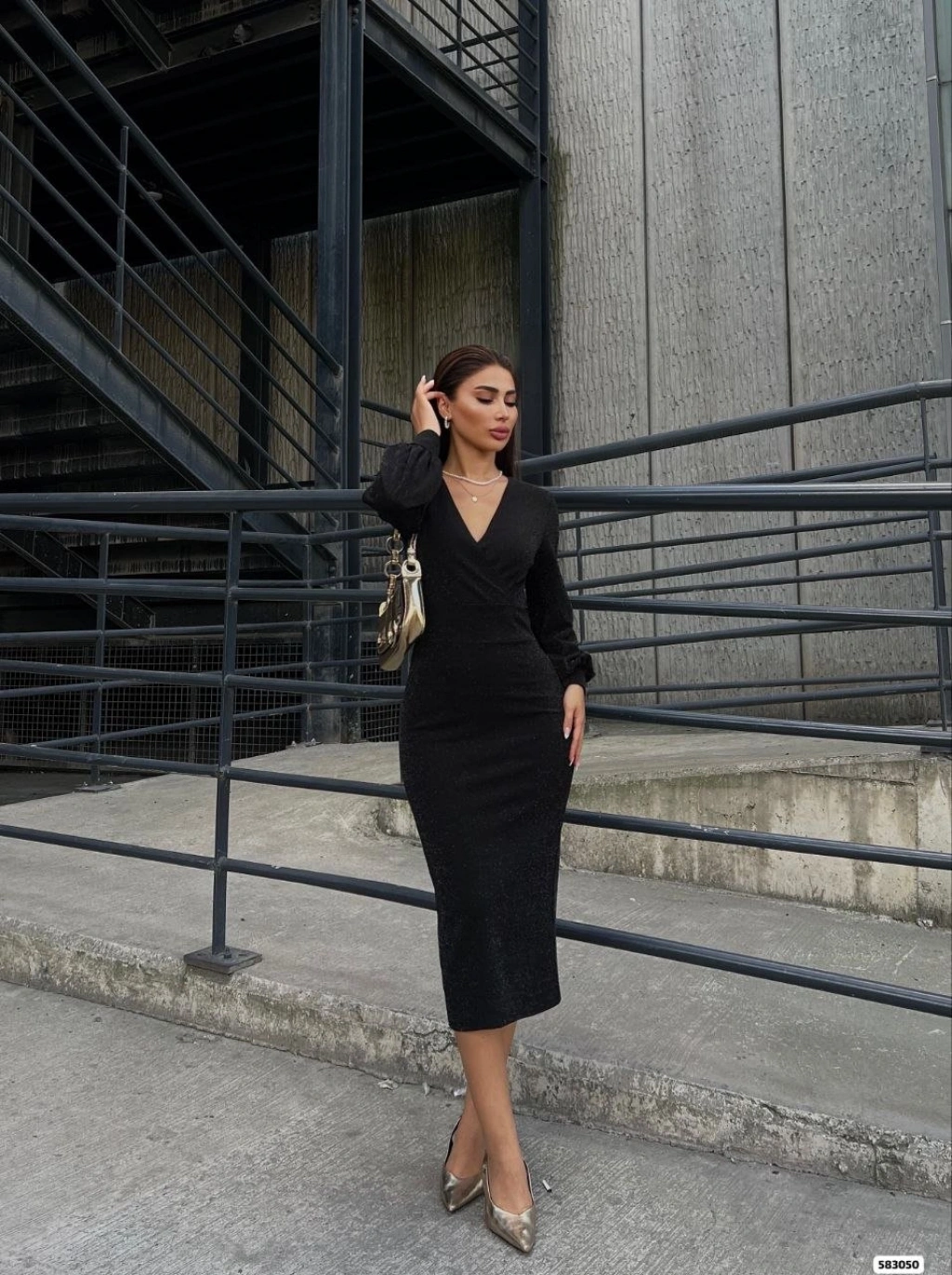 Kadın Kruvaze Yaka Balon Kol Simli Krep Kumaş Midi Boy Elbise