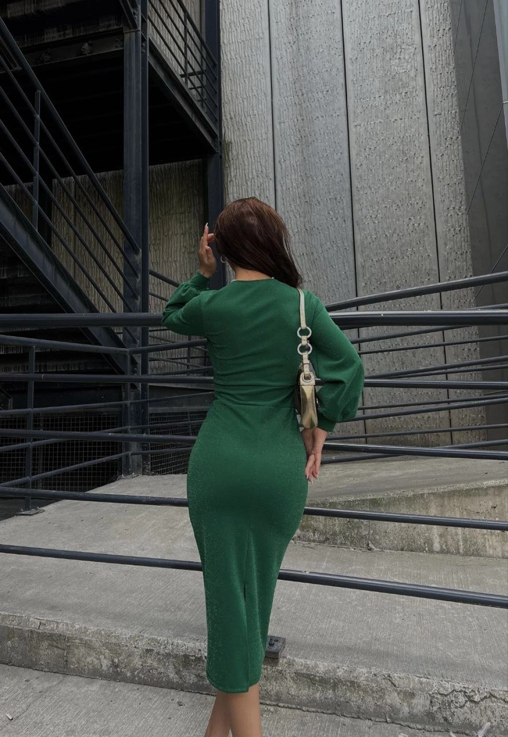 Kadın Kruvaze Yaka Balon Kol Simli Krep Kumaş Midi Boy Elbise