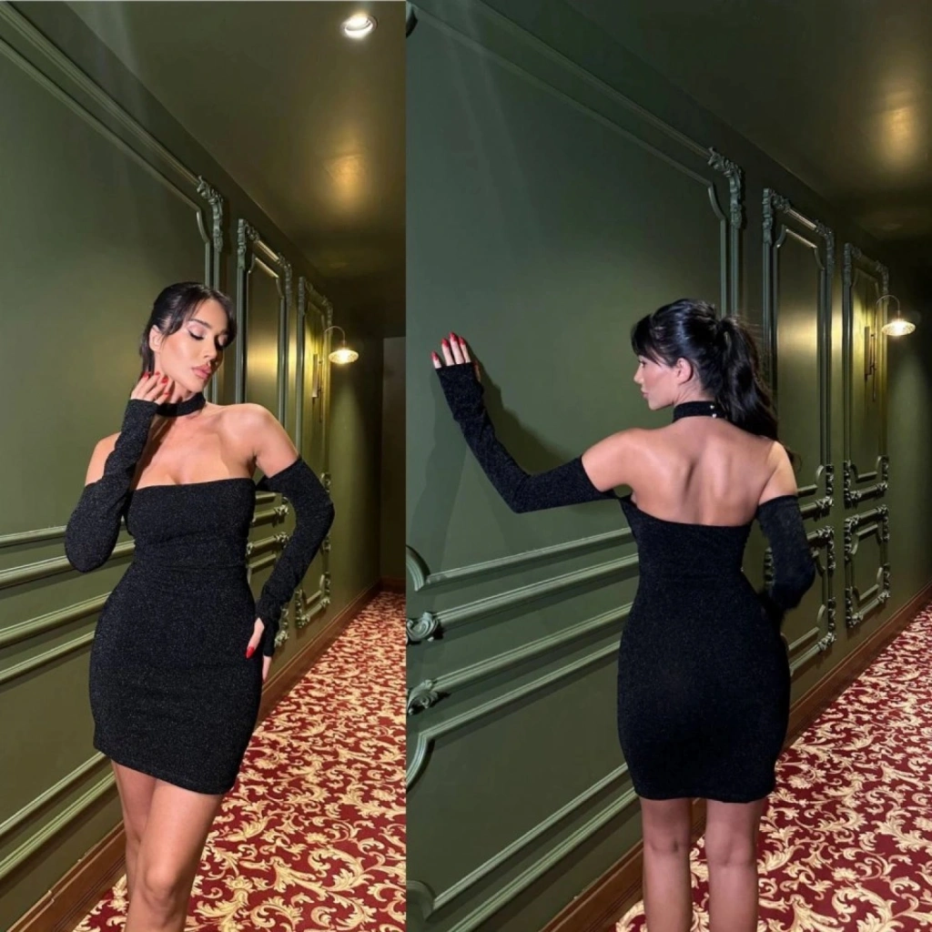 Kadın Madonna Yaka Simli Flower Kumaş Mini Elbise