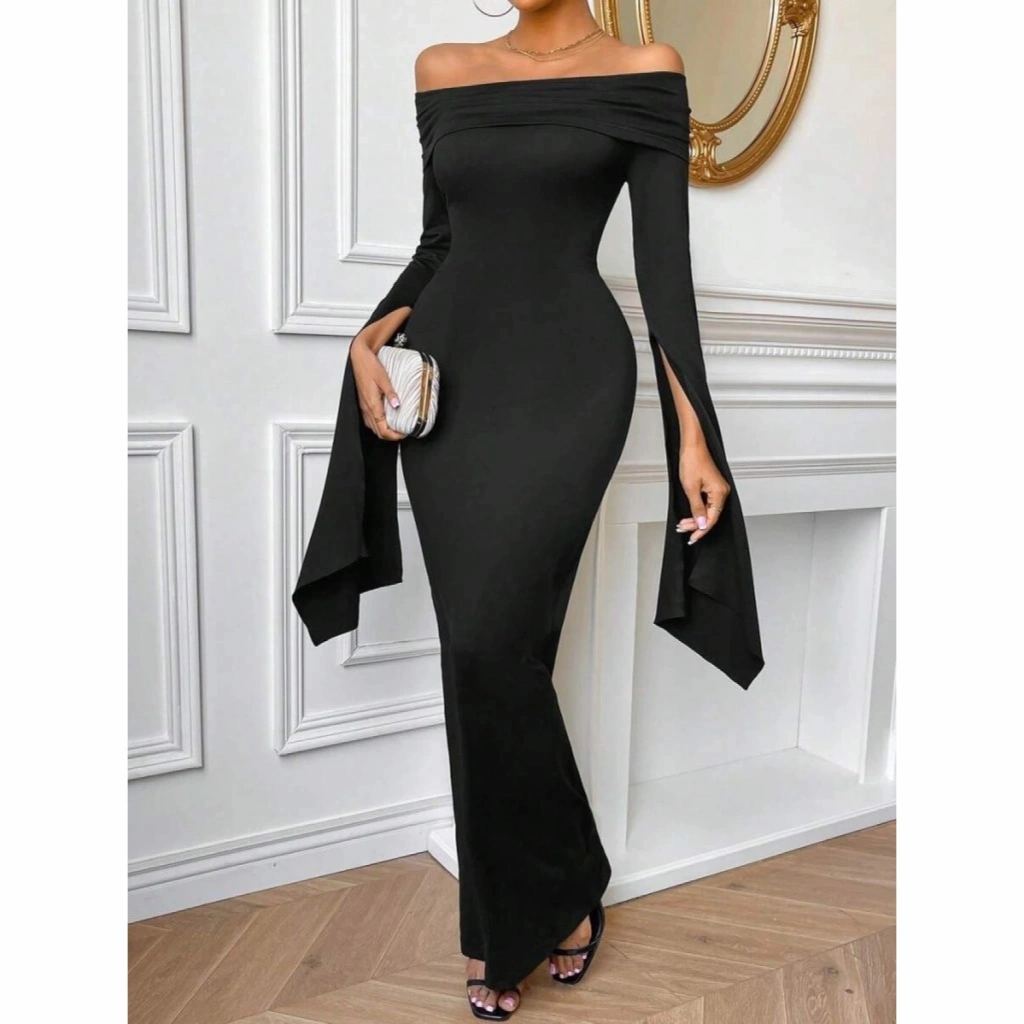 Kadın Madonna Yaka Uzun Yırtmaç Kol Detaylı Uzun Ithal Krep Elbise