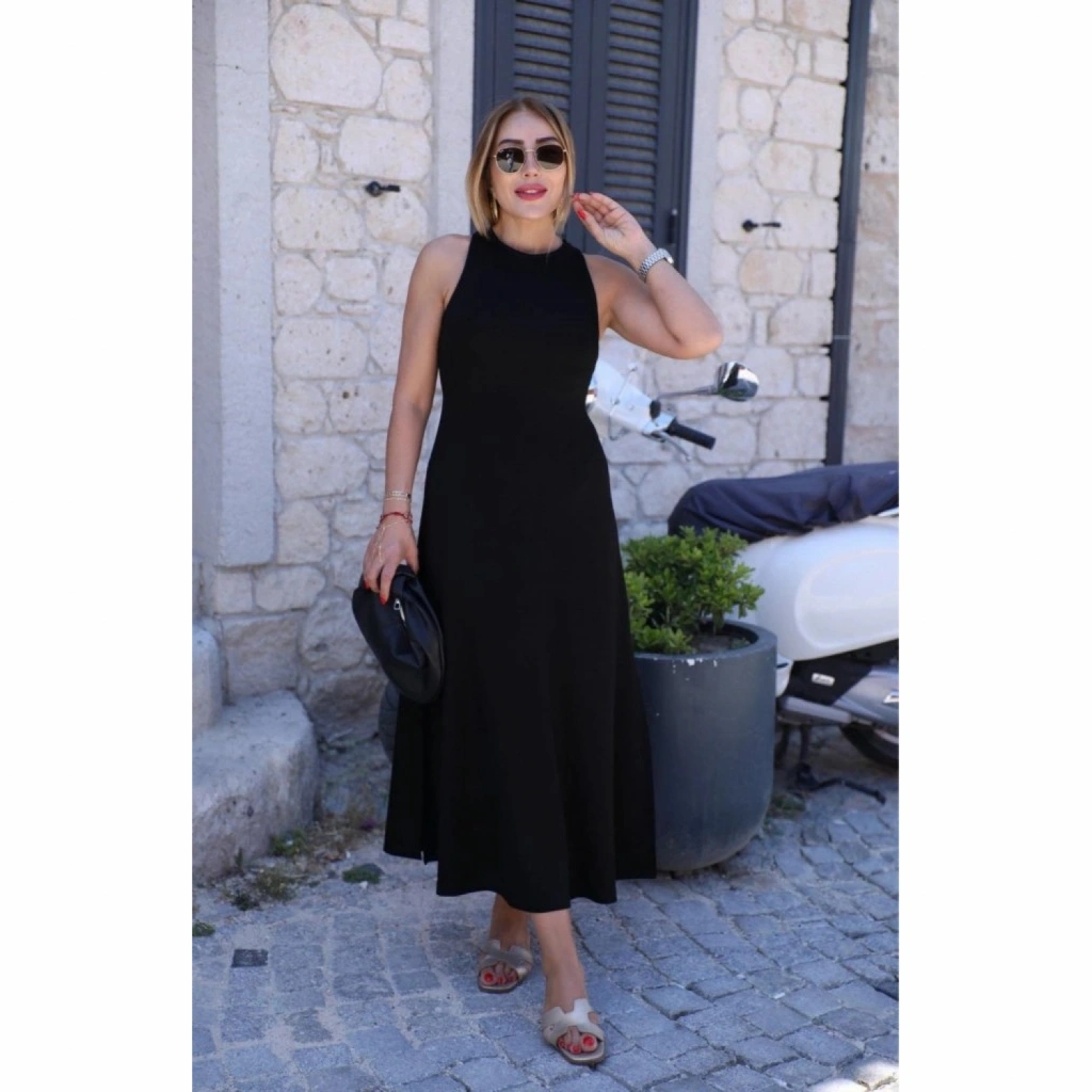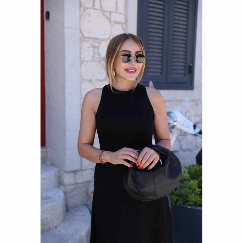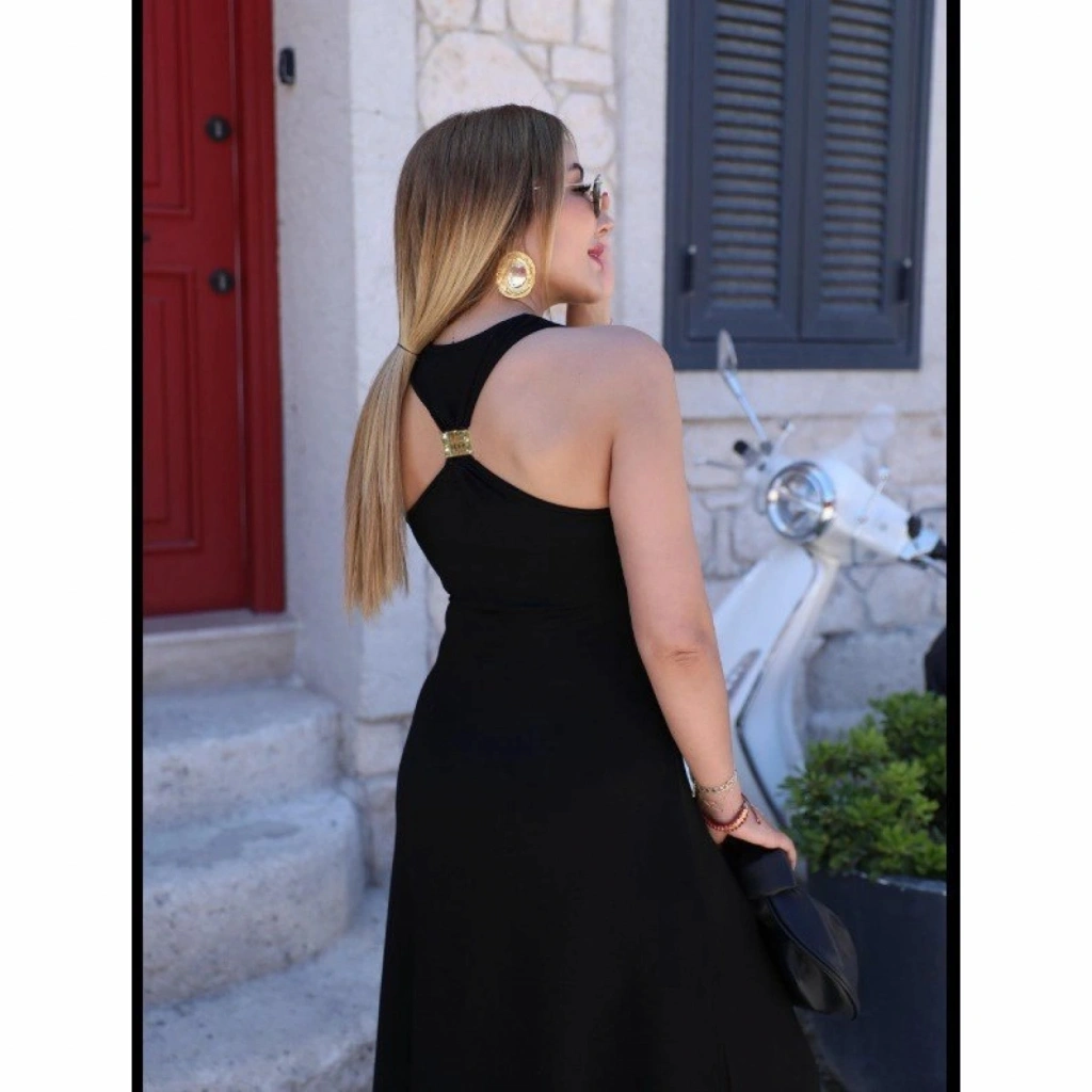 Kadın Omuzlardan Açık Arkadan Aksesuar Detaylı Yırtmaçlı Janjan Krep Elbise
